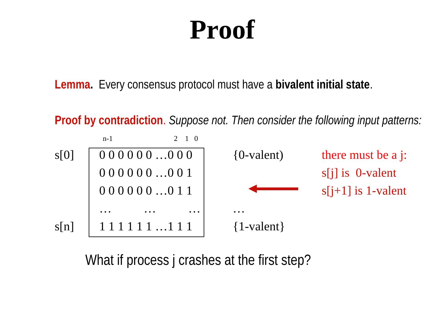 10 . Proof Lemma. Every consensus protocol must have a bivalent initial state. Proof by contradiction. Suppose not. Then consider the following input patterns: n-1 2 1 0 s[0] 0 0 0 0 0 0 …0 0 0 {0-valent) there must be a j: 0 0 0 0 0 0 …0 0 1 s[j] is 0-valent 0 0 0 0 0 0 …0 1 1 s[j+1] is 1-valent … … … … s[n] 1 1 1 1 1 1 …1 1 1 {1-valent} What if process j crashes at the first step?