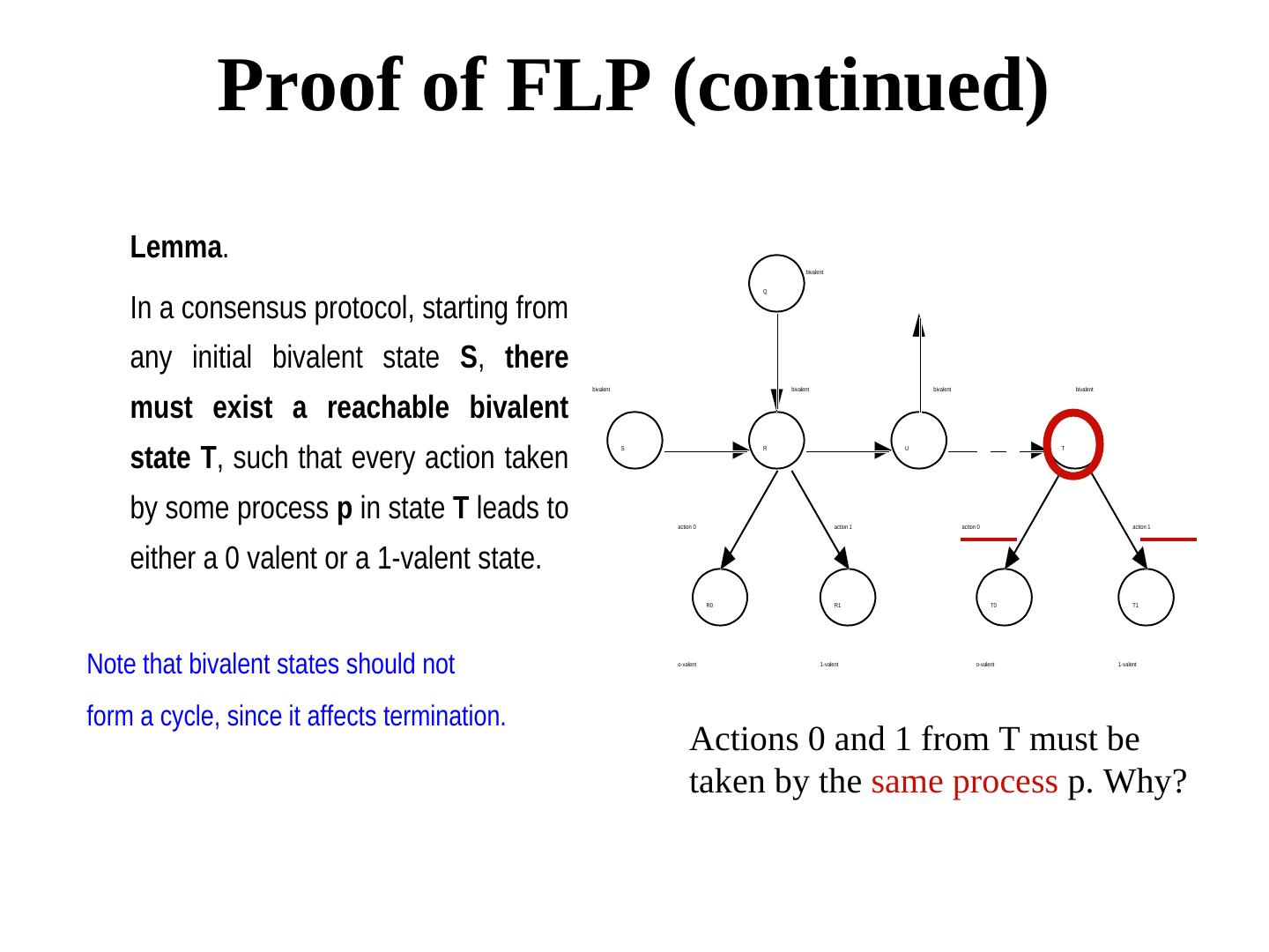 11 . Proof of FLP (continued) Lemma. bivalent In a consensus protocol, starting from Q any initial bivalent state S, there bivalent bivalent bivalent bivalent must exist a reachable bivalent state T, such that every action taken S R U T by some process p in state T leads to action 0 action 1 action 0 action 1 either a 0 valent or a 1-valent state. R0 R1 T0 T1 Note that bivalent states should not o-valent 1-valent o-valent 1-valent form a cycle, since it affects termination. Actions 0 and 1 from T must be taken by the same process p. Why?