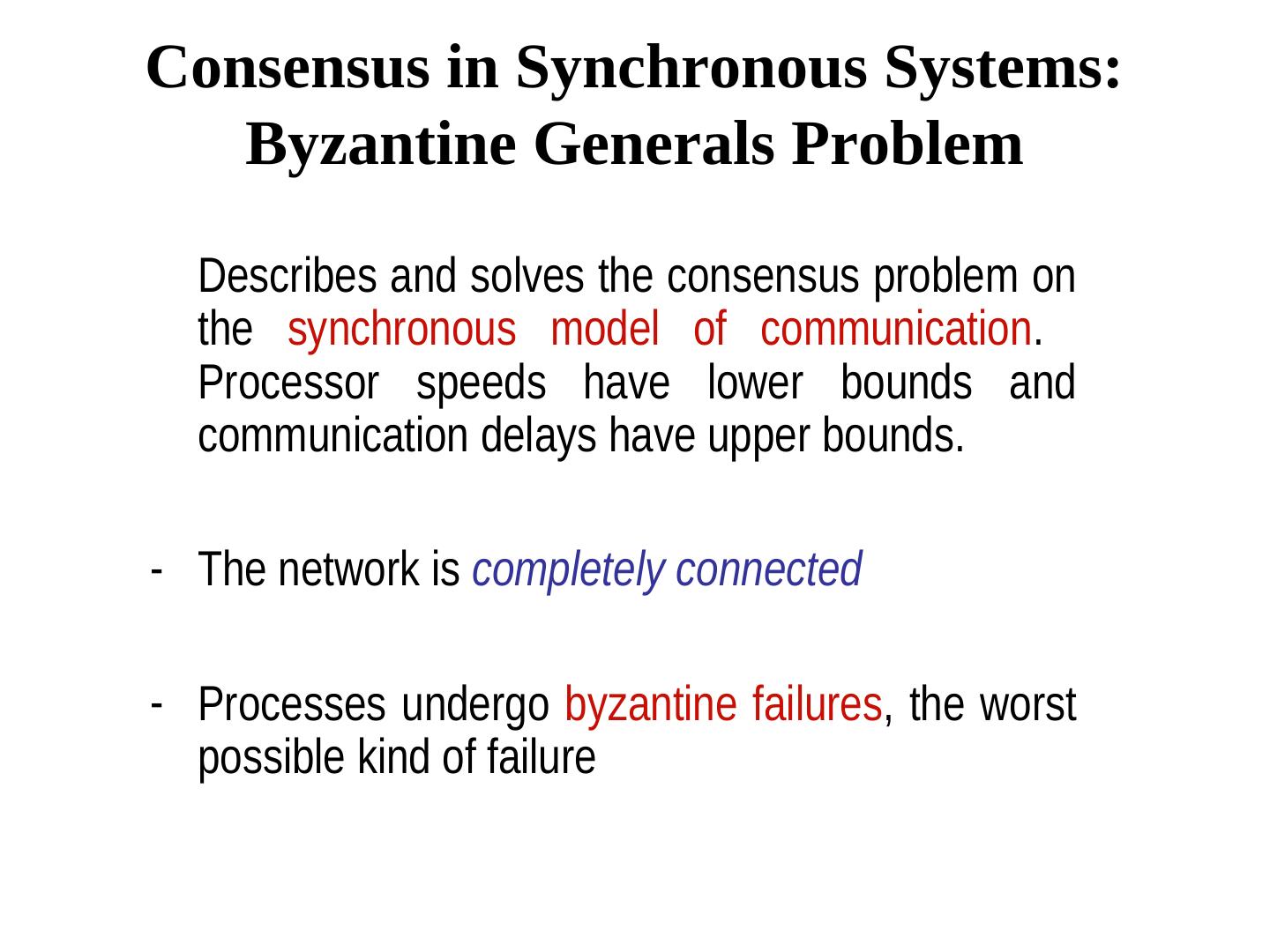 17 .Consensus in Synchronous Systems: Byzantine Generals Problem Describes and solves the consensus problem on the synchronous model of communication. Processor speeds have lower bounds and communication delays have upper bounds. - The network is completely connected - Processes undergo byzantine failures, the worst possible kind of failure