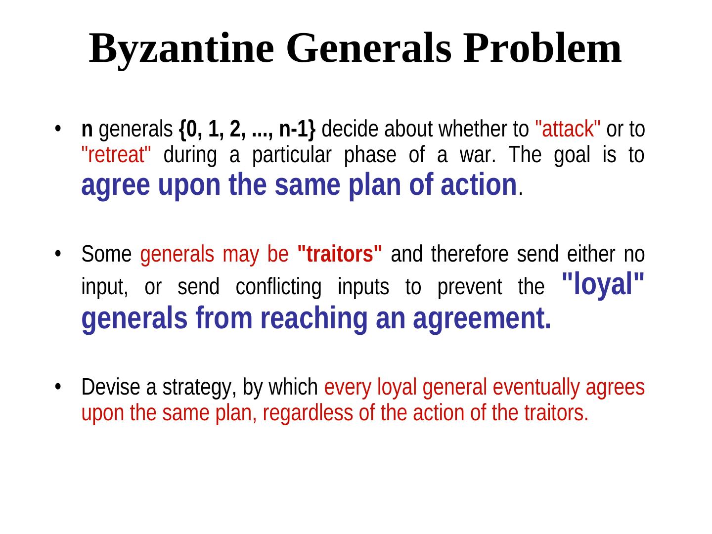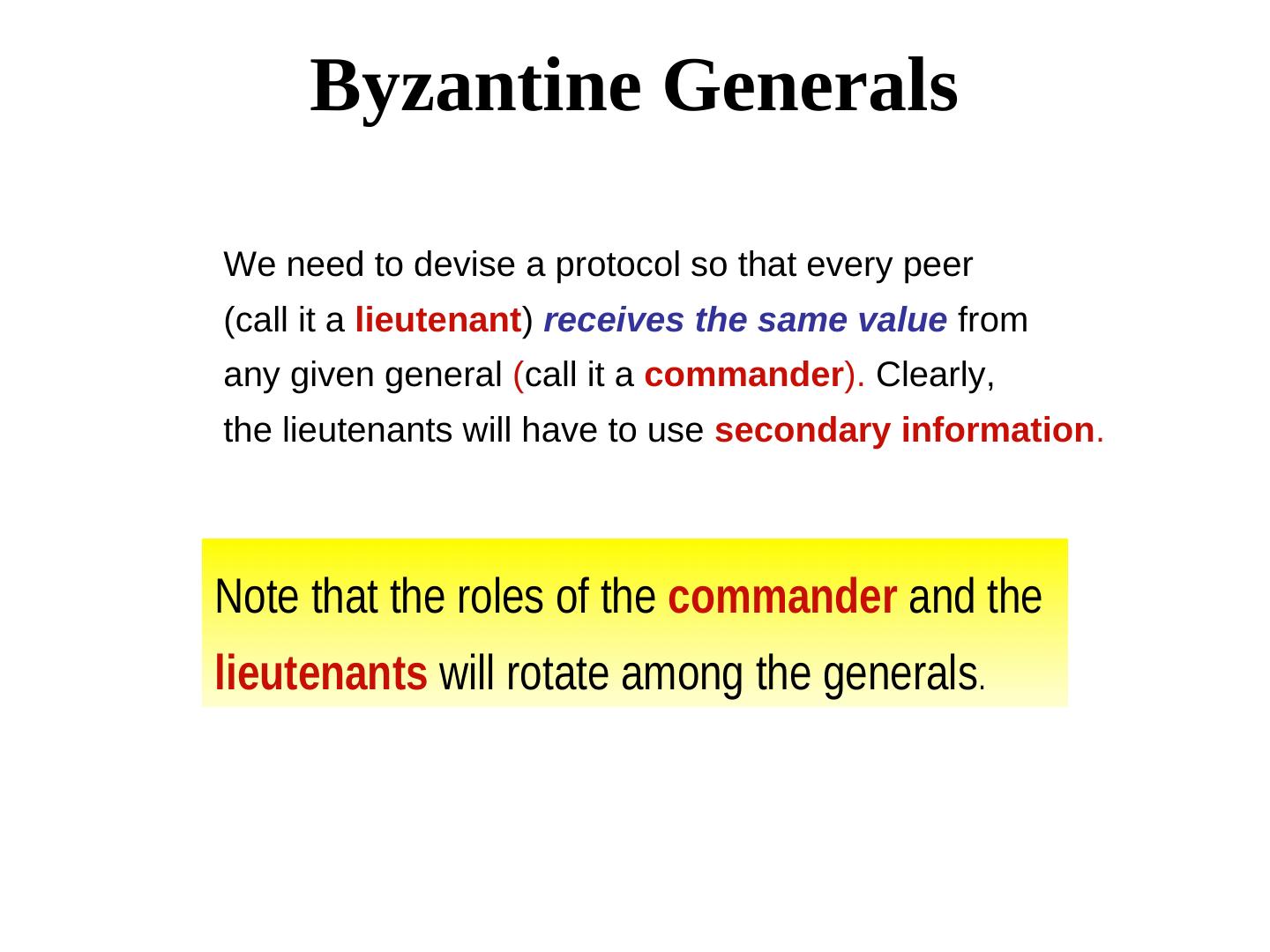 20 . Byzantine Generals We need to devise a protocol so that every peer (call it a lieutenant) receives the same value from any given general (call it a commander). Clearly, the lieutenants will have to use secondary information. Note that the roles of the commander and the lieutenants will rotate among the generals.