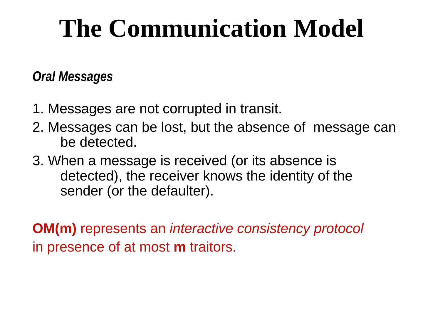 22 . The Communication Model Oral Messages 1. Messages are not corrupted in transit. 2. Messages can be lost, but the absence of message can be detected. 3. When a message is received (or its absence is detected), the receiver knows the identity of the sender (or the defaulter). OM(m) represents an interactive consistency protocol in presence of at most m traitors.