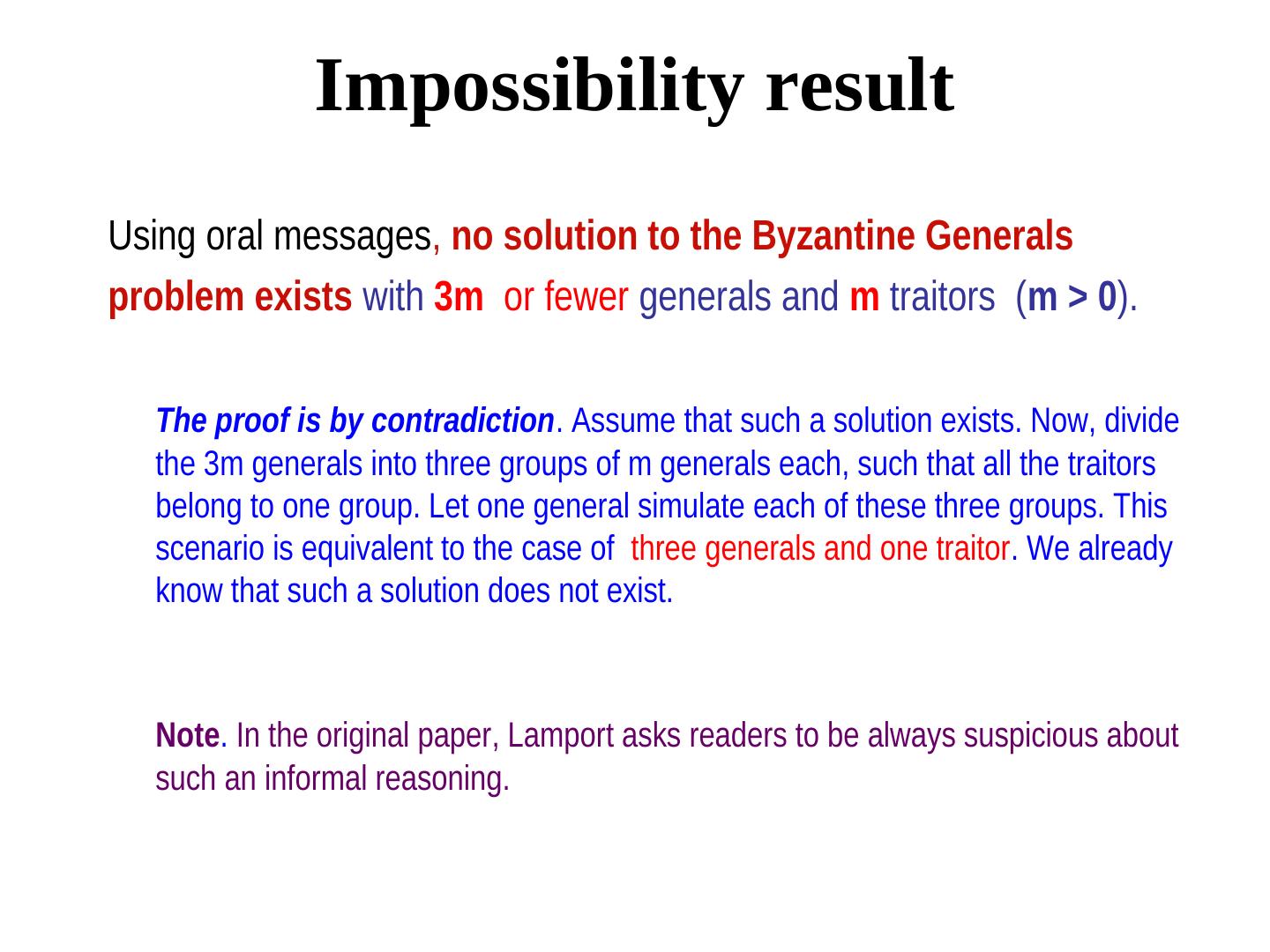 24 . Impossibility result Using oral messages, no solution to the Byzantine Generals problem exists with 3m or fewer generals and m traitors (m > 0). The proof is by contradiction. Assume that such a solution exists. Now, divide the 3m generals into three groups of m generals each, such that all the traitors belong to one group. Let one general simulate each of these three groups. This scenario is equivalent to the case of three generals and one traitor. We already know that such a solution does not exist. Note. In the original paper, Lamport asks readers to be always suspicious about such an informal reasoning.