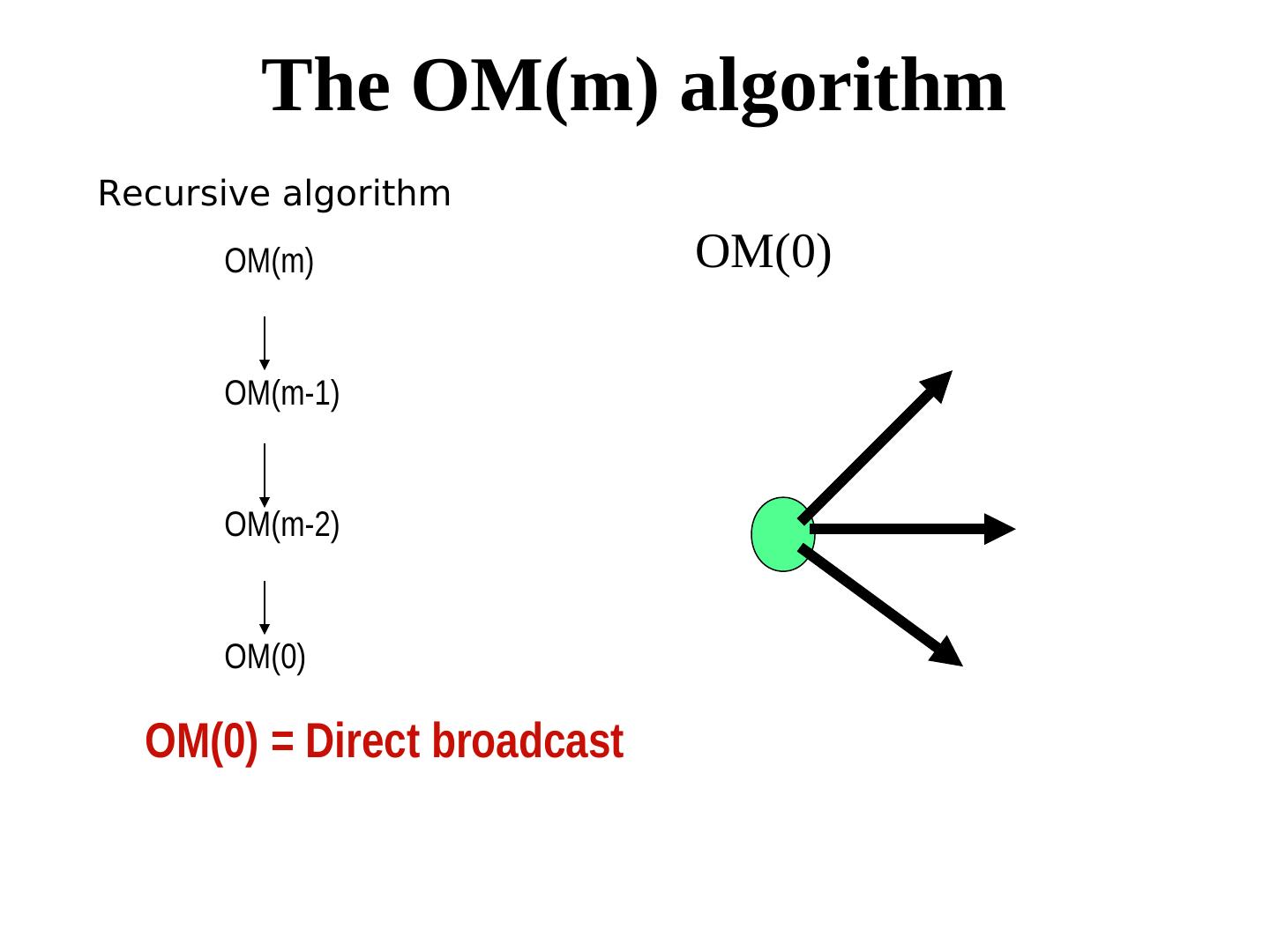 25 . The OM(m) algorithm Recursive algorithm OM(m) OM(0) OM(m-1) OM(m-2) OM(0) OM(0) = Direct broadcast