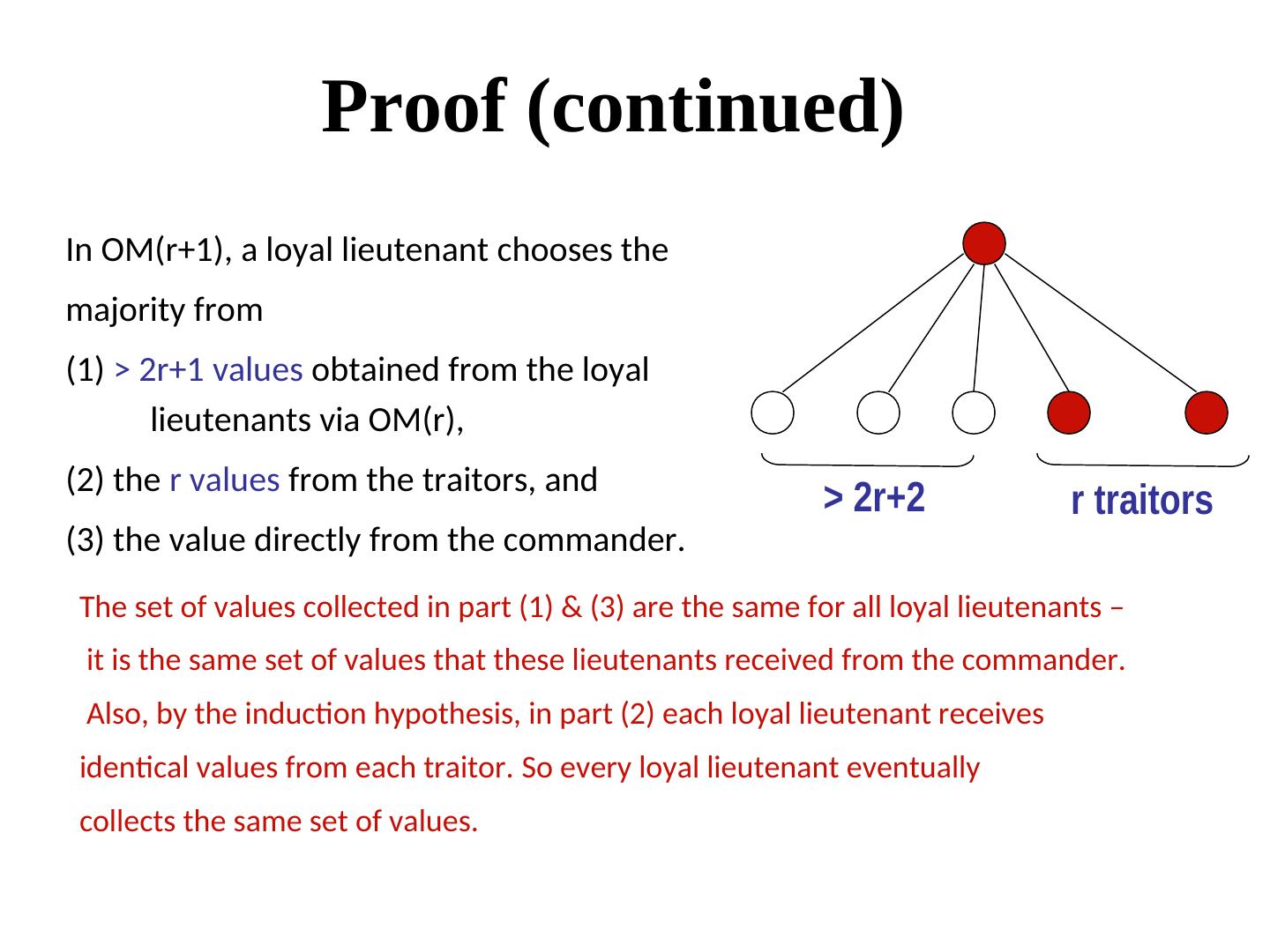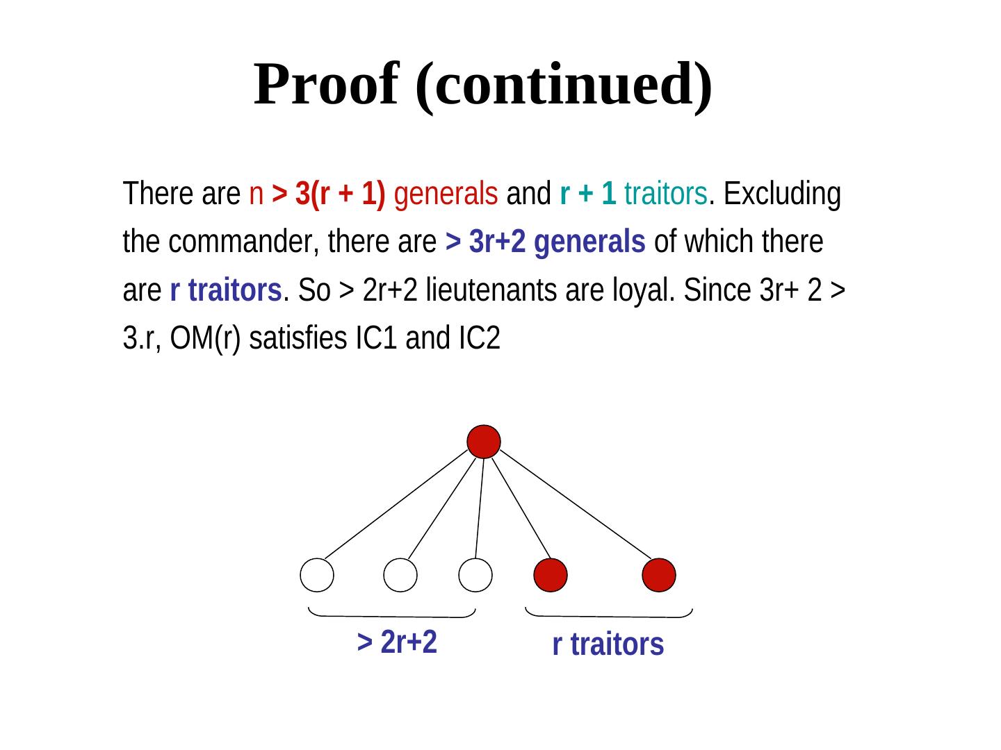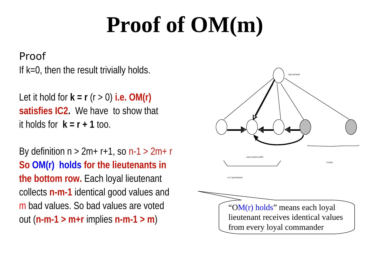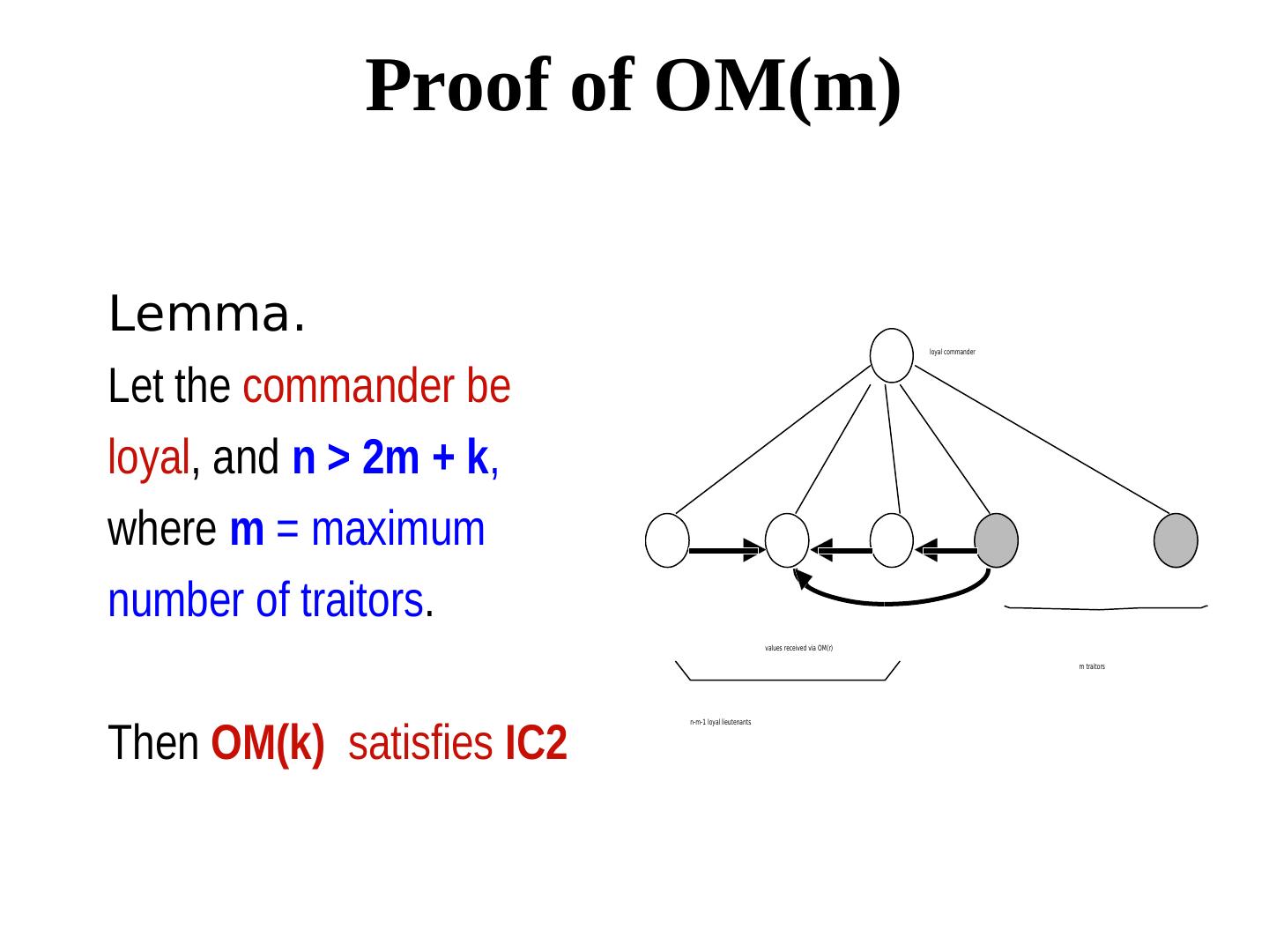 29 . Proof of OM(m) Lemma. loyal commander Let the commander be loyal, and n > 2m + k, where m = maximum number of traitors. values received via OM(r) m traitors Then OM(k) satisfies IC2 n-m-1 loyal lieutenants