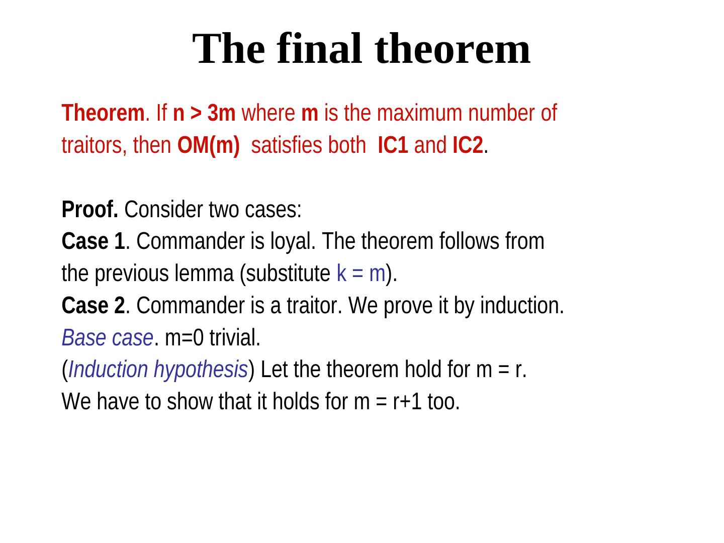 21 . Interactive consistency specifications commander IC1. Every loyal lieutenant receives the same order from the commander. IC2. If the commander is loyal, then every loyal lieutenant receives the order that the commander sends. lieutenants