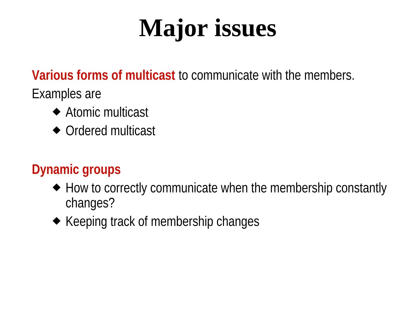 2 . Major issues Various forms of multicast to communicate with the members. Examples are Atomic multicast Ordered multicast Dynamic groups How to correctly communicate when the membership constantly changes? Keeping track of membership changes