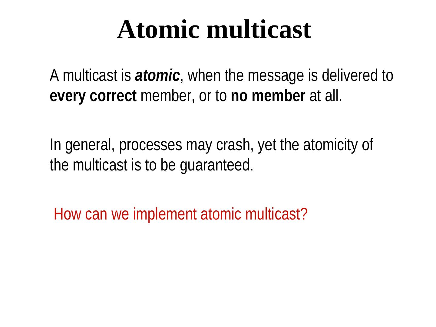 3 . Atomic multicast A multicast is atomic, when the message is delivered to every correct member, or to no member at all. In general, processes may crash, yet the atomicity of the multicast is to be guaranteed. How can we implement atomic multicast?