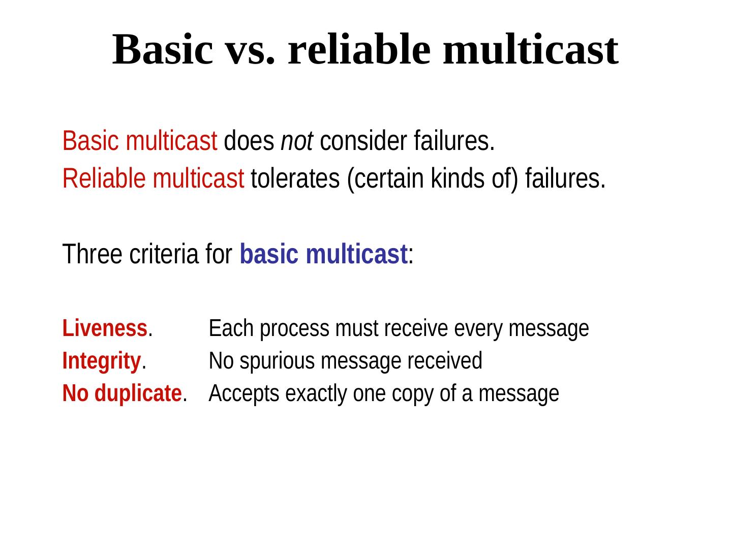 4 . Basic vs. reliable multicast Basic multicast does not consider failures. Reliable multicast tolerates (certain kinds of) failures. Three criteria for basic multicast: Liveness. Each process must receive every message Integrity. No spurious message received No duplicate. Accepts exactly one copy of a message