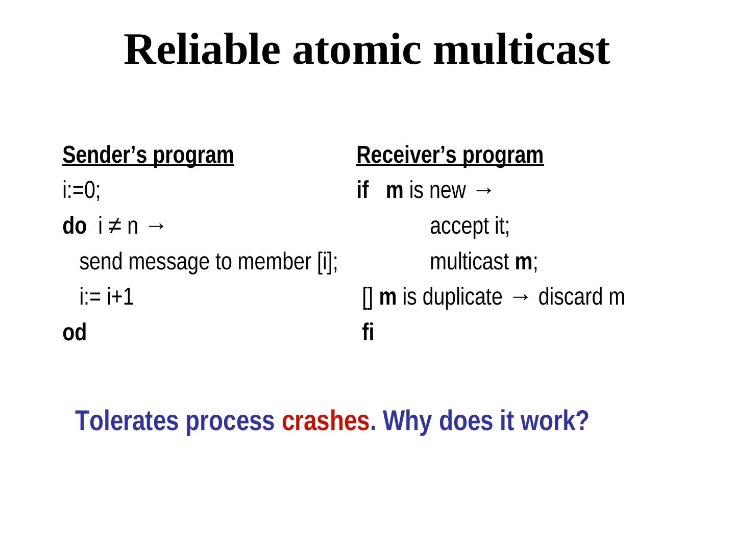 5 . Reliable atomic multicast Sender’s program Receiver’s program i:=0; if m is new → do i ≠ n → accept it; send message to member [i]; multicast m; i:= i+1 [] m is duplicate → discard m od fi Tolerates process crashes. Why does it work?