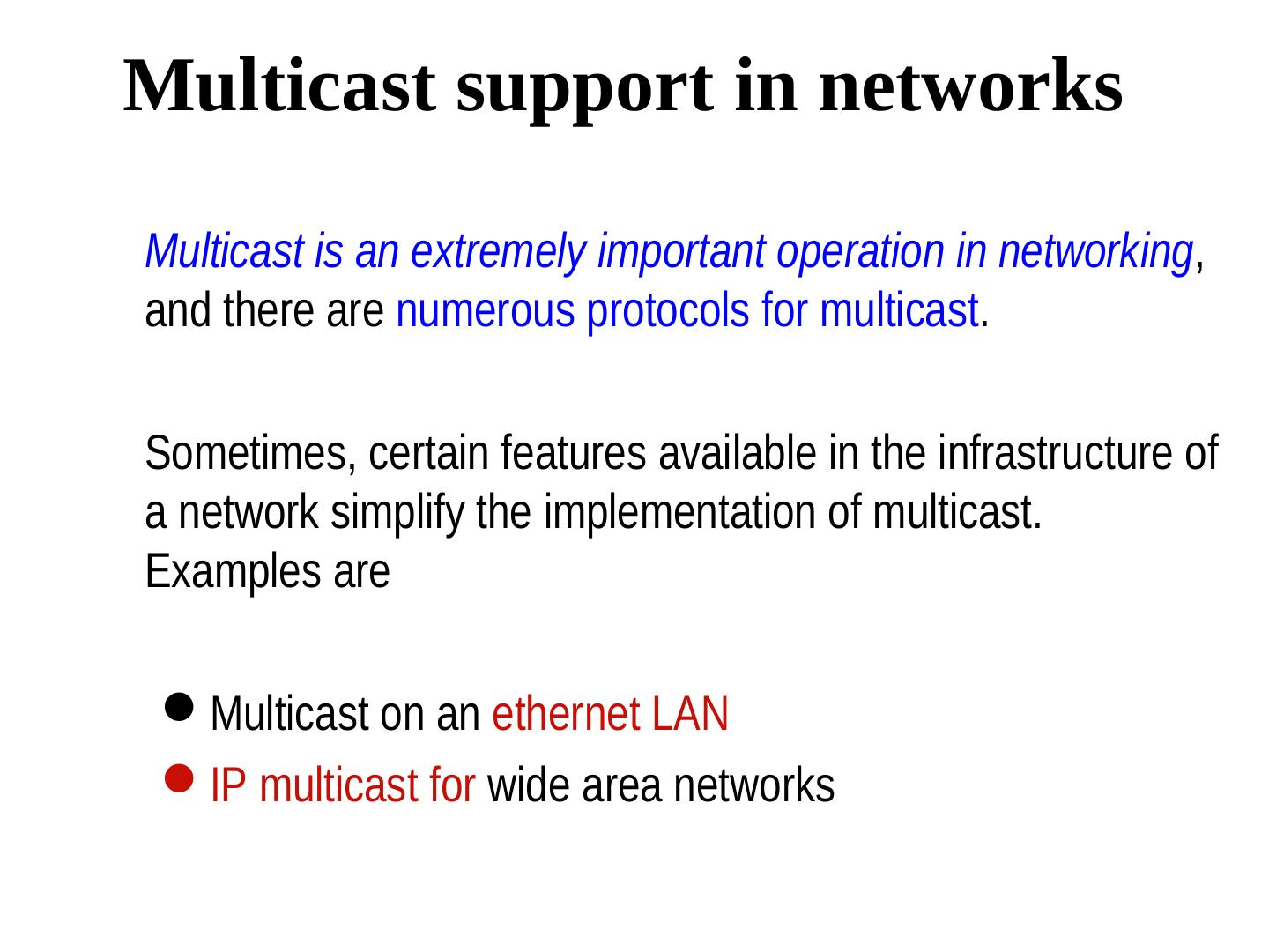 6 .Multicast support in networks Multicast is an extremely important operation in networking, and there are numerous protocols for multicast. Sometimes, certain features available in the infrastructure of a network simplify the implementation of multicast. Examples are Multicast on an ethernet LAN IP multicast for wide area networks