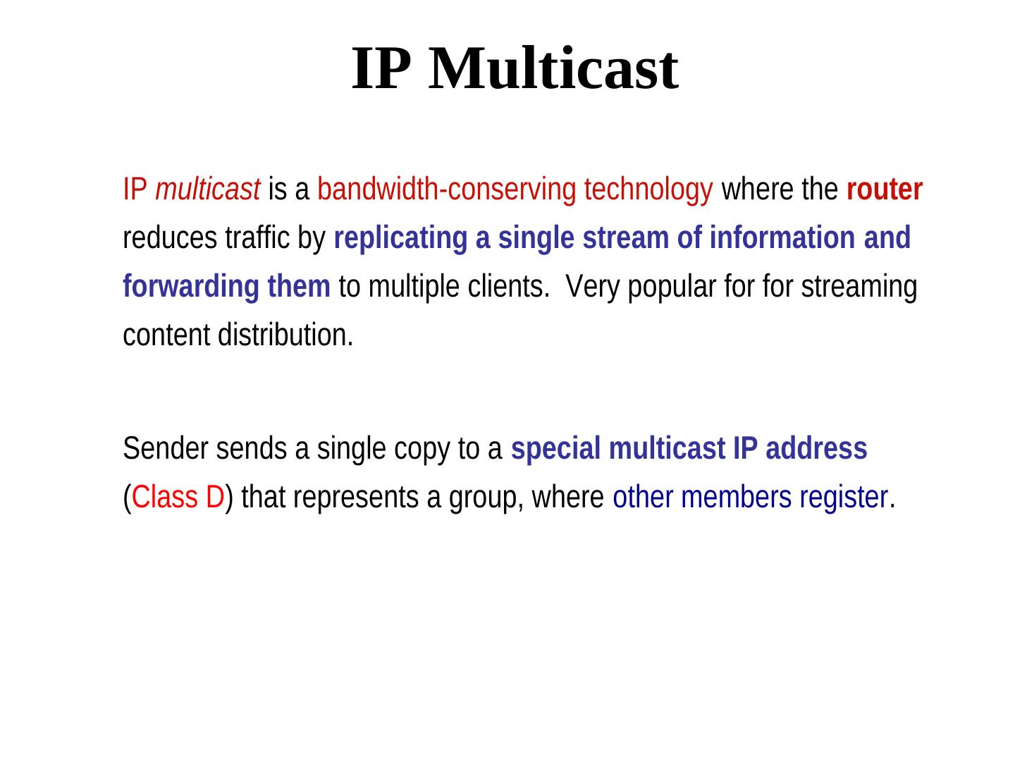 7 . IP Multicast IP multicast is a bandwidth-conserving technology where the router reduces traffic by replicating a single stream of information and forwarding them to multiple clients. Very popular for for streaming content distribution. Sender sends a single copy to a special multicast IP address (Class D) that represents a group, where other members register.