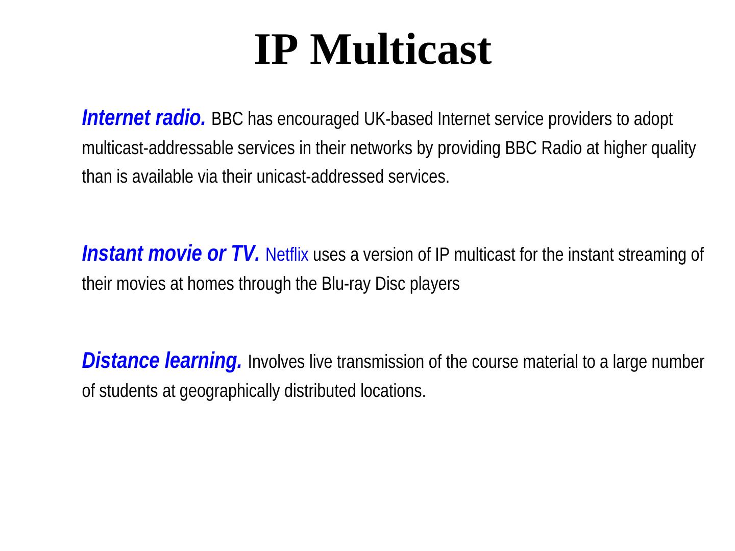 8 . IP Multicast Internet radio. BBC has encouraged UK-based Internet service providers to adopt multicast-addressable services in their networks by providing BBC Radio at higher quality than is available via their unicast-addressed services. Instant movie or TV. Netflix uses a version of IP multicast for the instant streaming of their movies at homes through the Blu-ray Disc players Distance learning. Involves live transmission of the course material to a large number of students at geographically distributed locations.