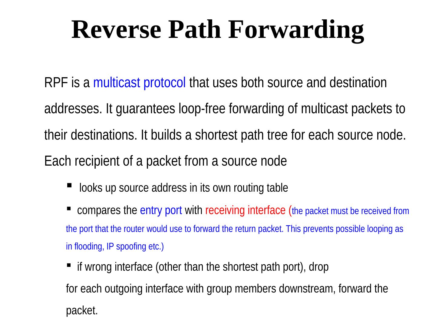 12 . Reverse Path Forwarding RPF is a multicast protocol that uses both source and destination addresses. It guarantees loop-free forwarding of multicast packets to their destinations. It builds a shortest path tree for each source node. Each recipient of a packet from a source node looks up source address in its own routing table compares the entry port with receiving interface (the packet must be received from the port that the router would use to forward the return packet. This prevents possible looping as in flooding, IP spoofing etc.) if wrong interface (other than the shortest path port), drop for each outgoing interface with group members downstream, forward the packet.