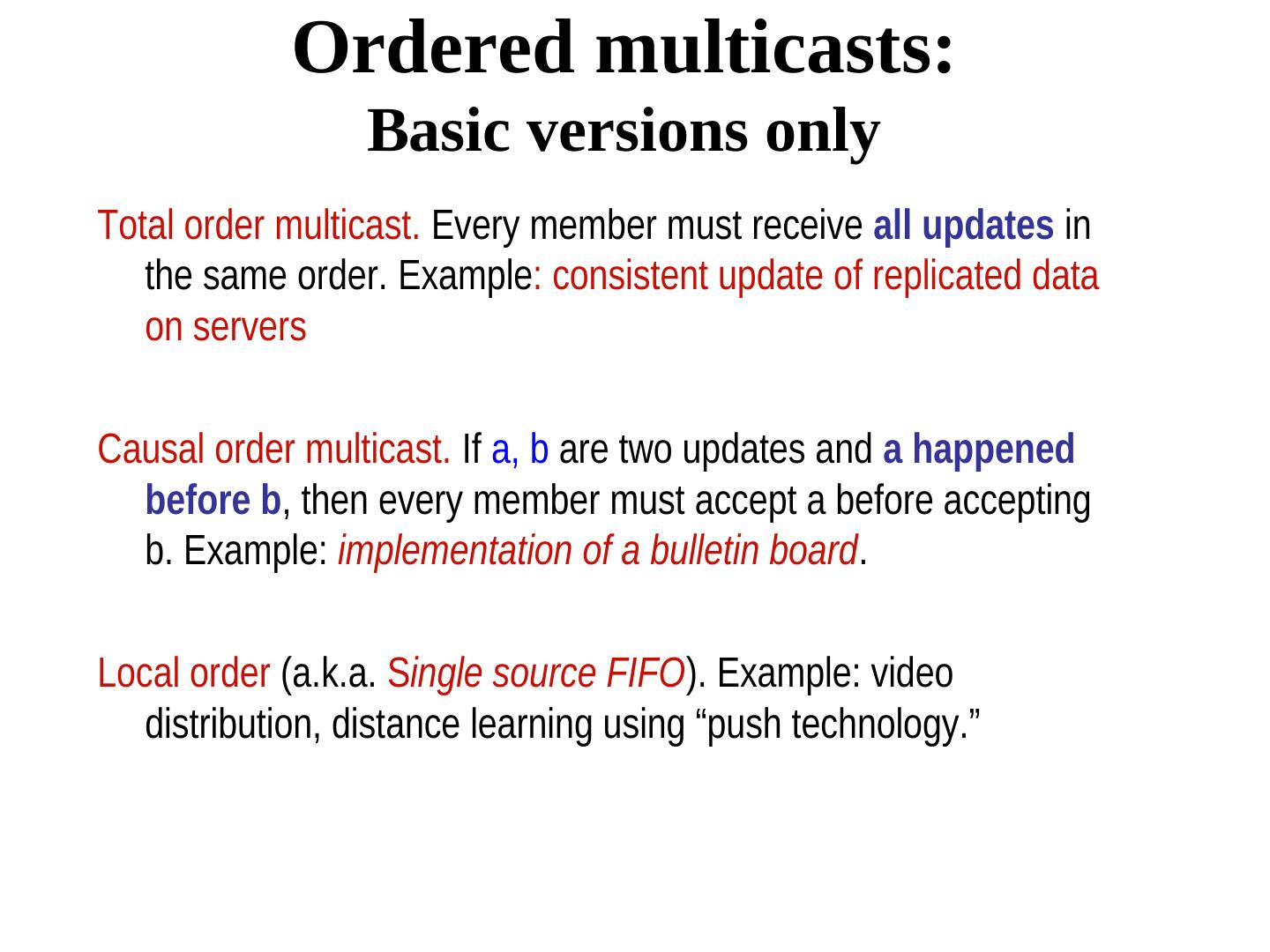 14 . Ordered multicasts: Basic versions only Total order multicast. Every member must receive all updates in the same order. Example: consistent update of replicated data on servers Causal order multicast. If a, b are two updates and a happened before b, then every member must accept a before accepting b. Example: implementation of a bulletin board. Local order (a.k.a. Single source FIFO). Example: video distribution, distance learning using “push technology.”
