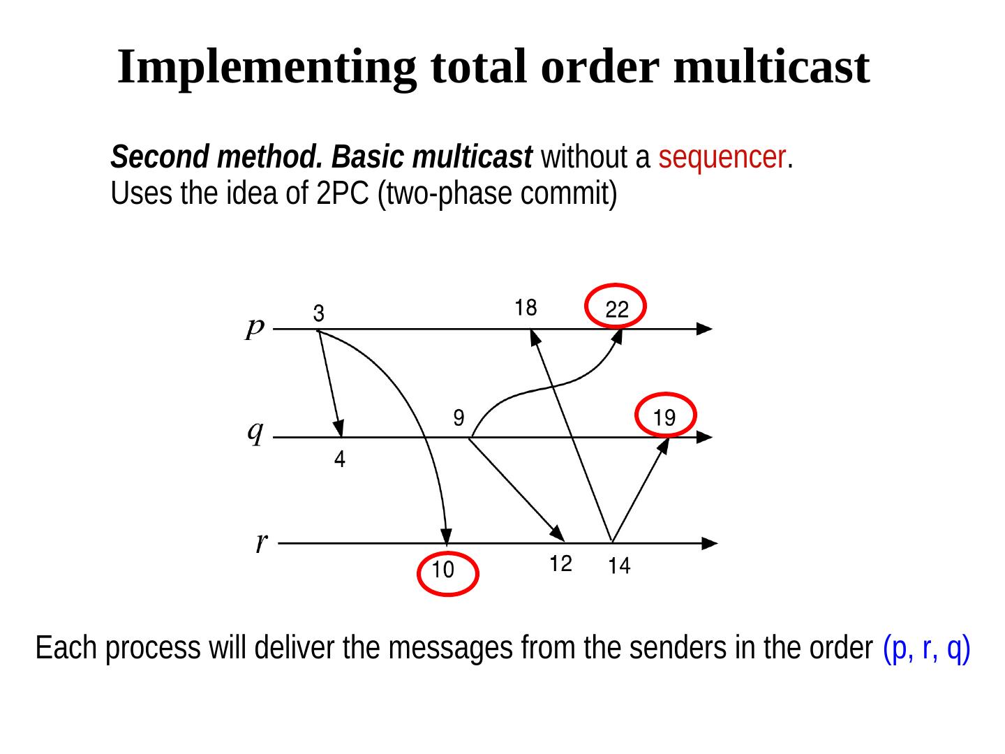 16 . Implementing total order multicast Second method. Basic multicast without a sequencer. Uses the idea of 2PC (two-phase commit) Each process will deliver the messages from the senders in the order (p, r, q)