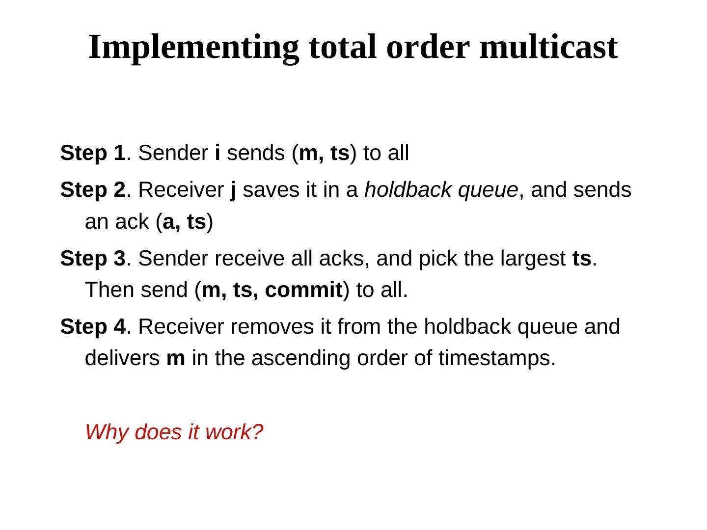 17 . Implementing total order multicast Step 1. Sender i sends (m, ts) to all Step 2. Receiver j saves it in a holdback queue, and sends an ack (a, ts) Step 3. Sender receive all acks, and pick the largest ts. Then send (m, ts, commit) to all. Step 4. Receiver removes it from the holdback queue and delivers m in the ascending order of timestamps. Why does it work?