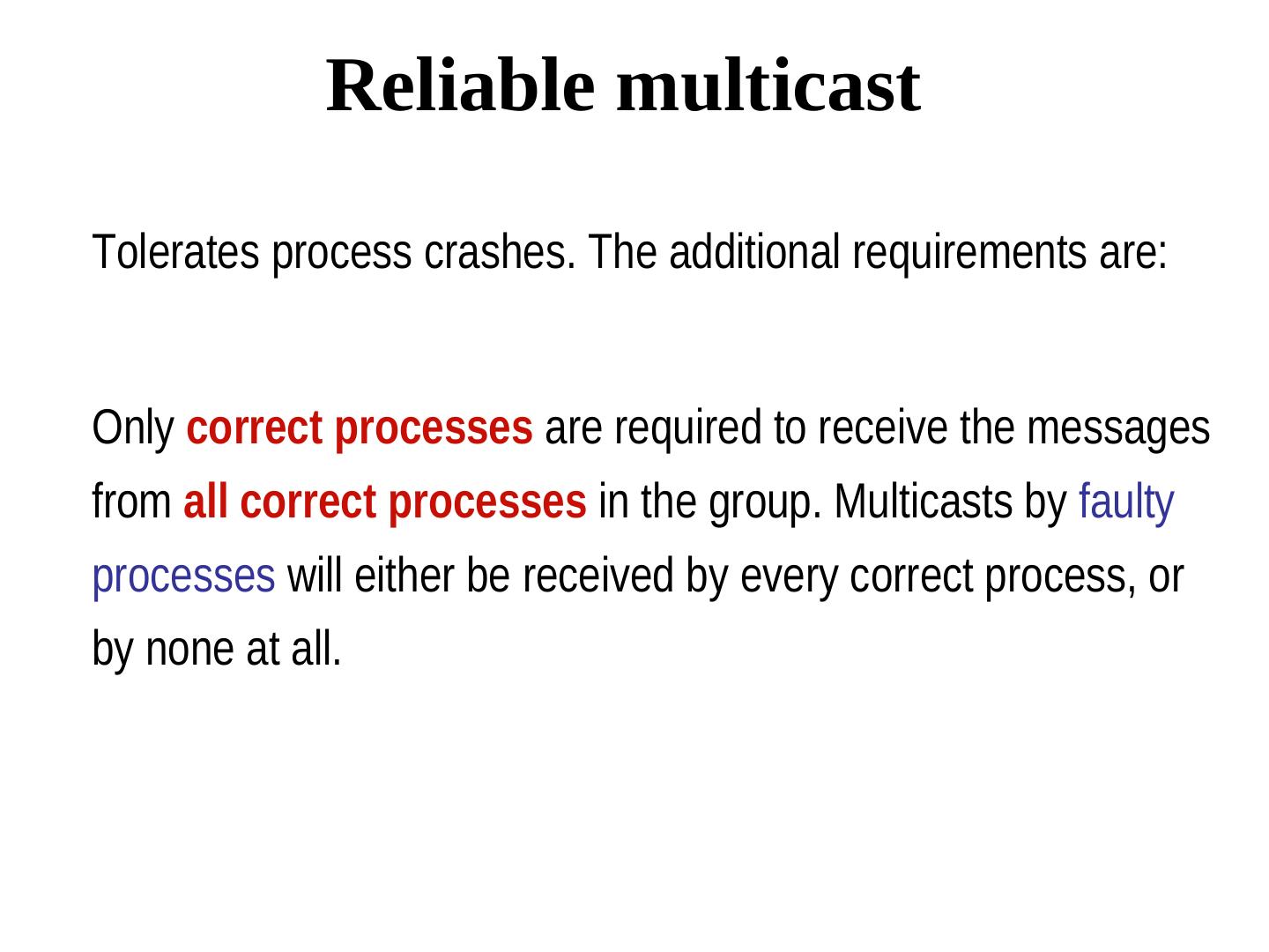19 . Reliable multicast Tolerates process crashes. The additional requirements are: Only correct processes are required to receive the messages from all correct processes in the group. Multicasts by faulty processes will either be received by every correct process, or by none at all.