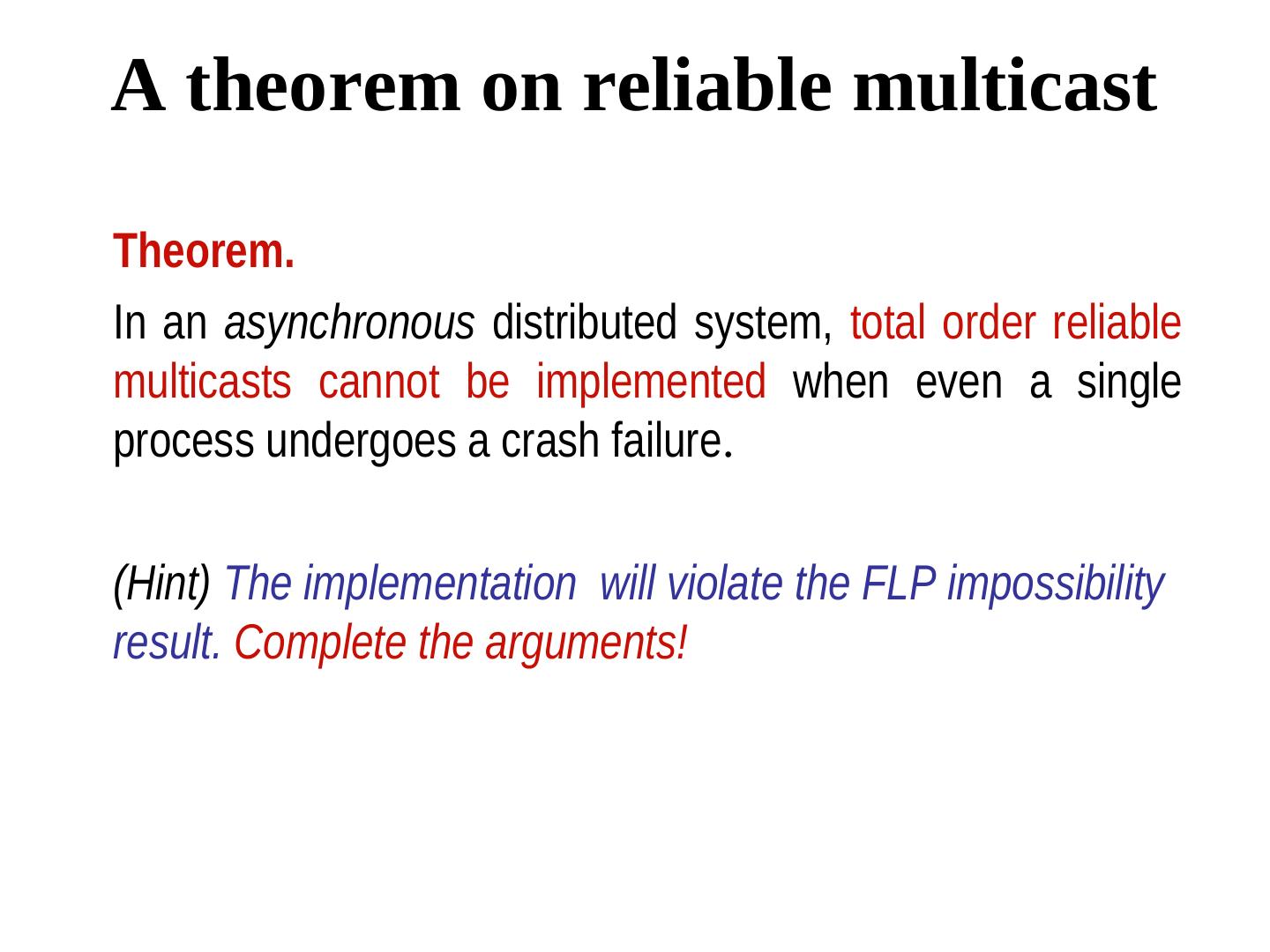 20 .A theorem on reliable multicast Theorem. In an asynchronous distributed system, total order reliable multicasts cannot be implemented when even a single process undergoes a crash failure. (Hint) The implementation will violate the FLP impossibility result. Complete the arguments!