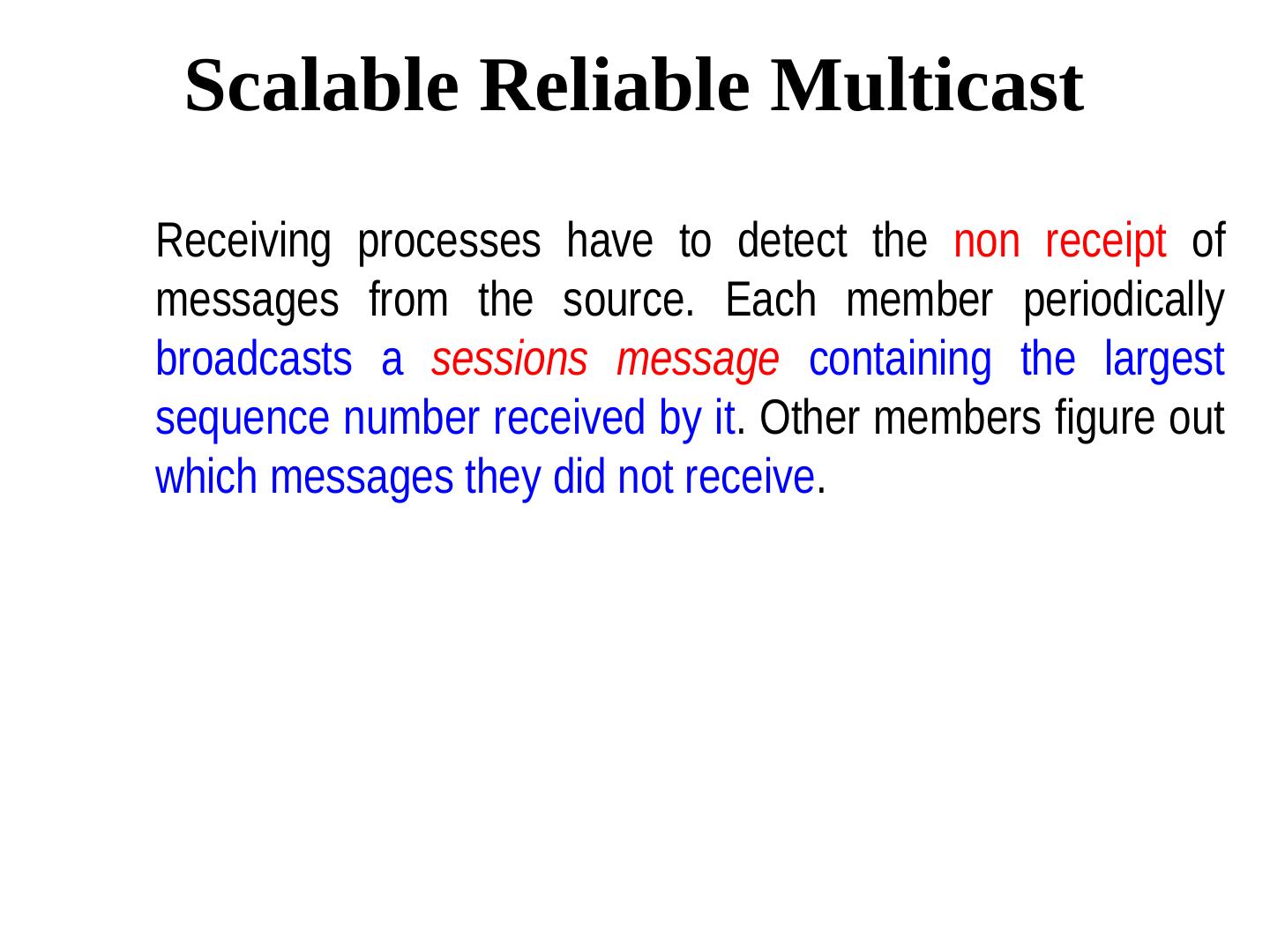23 . Scalable Reliable Multicast Receiving processes have to detect the non receipt of messages from the source. Each member periodically broadcasts a sessions message containing the largest sequence number received by it. Other members figure out which messages they did not receive.