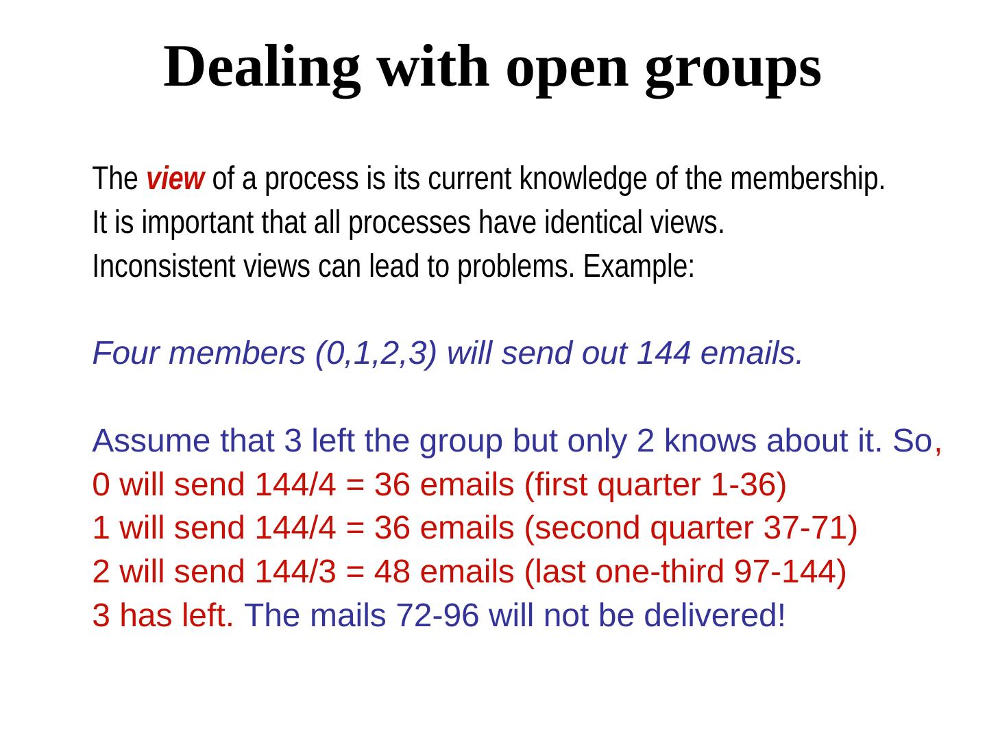 25 . Dealing with open groups The view of a process is its current knowledge of the membership. It is important that all processes have identical views. Inconsistent views can lead to problems. Example: Four members (0,1,2,3) will send out 144 emails. Assume that 3 left the group but only 2 knows about it. So, 0 will send 144/4 = 36 emails (first quarter 1-36) 1 will send 144/4 = 36 emails (second quarter 37-71) 2 will send 144/3 = 48 emails (last one-third 97-144) 3 has left. The mails 72-96 will not be delivered!