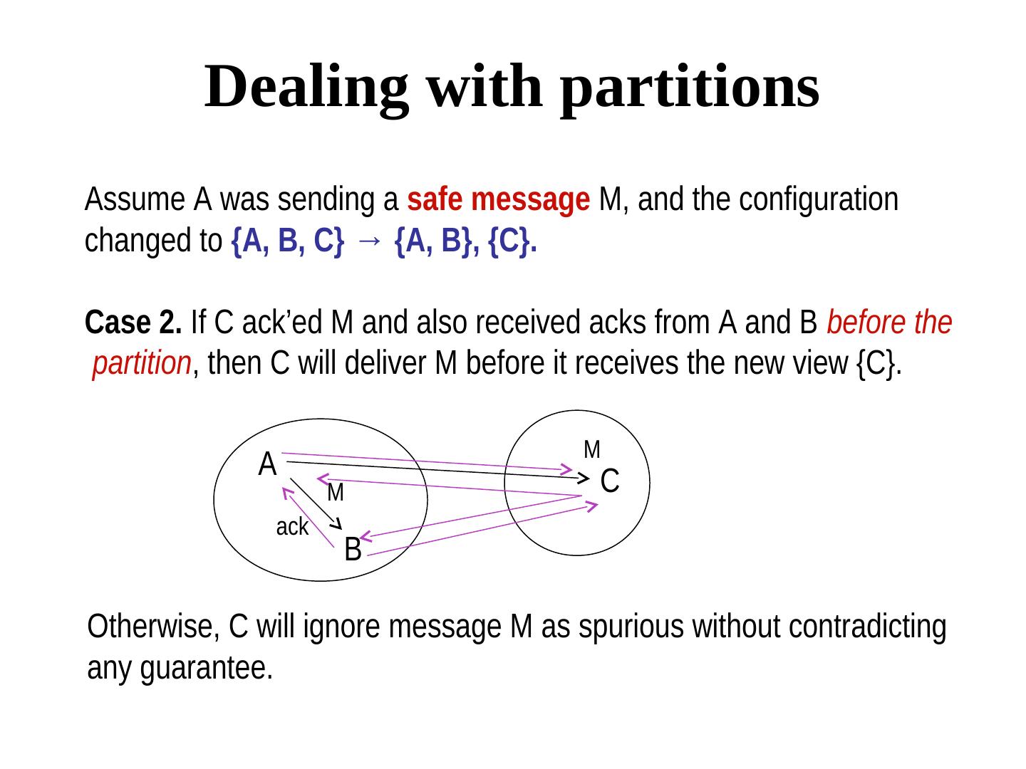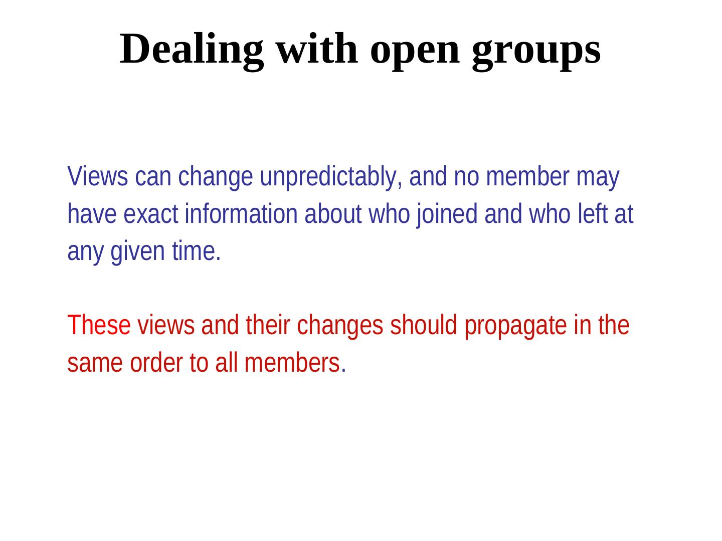 26 . Dealing with open groups Views can change unpredictably, and no member may have exact information about who joined and who left at any given time. These views and their changes should propagate in the same order to all members.