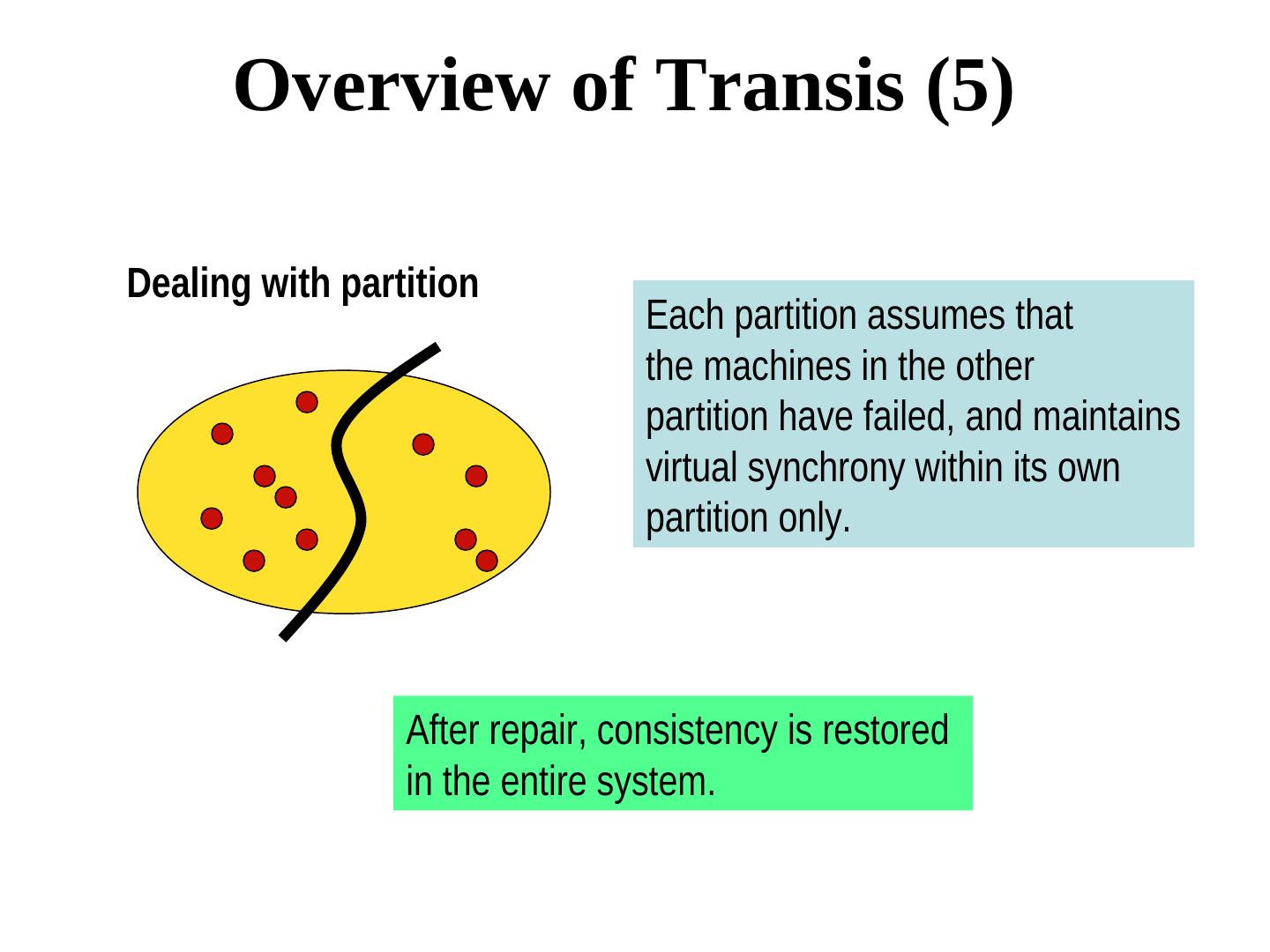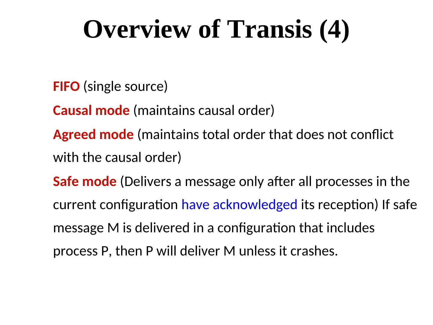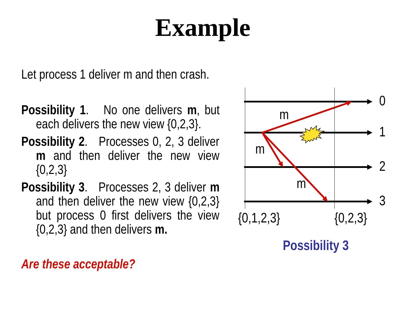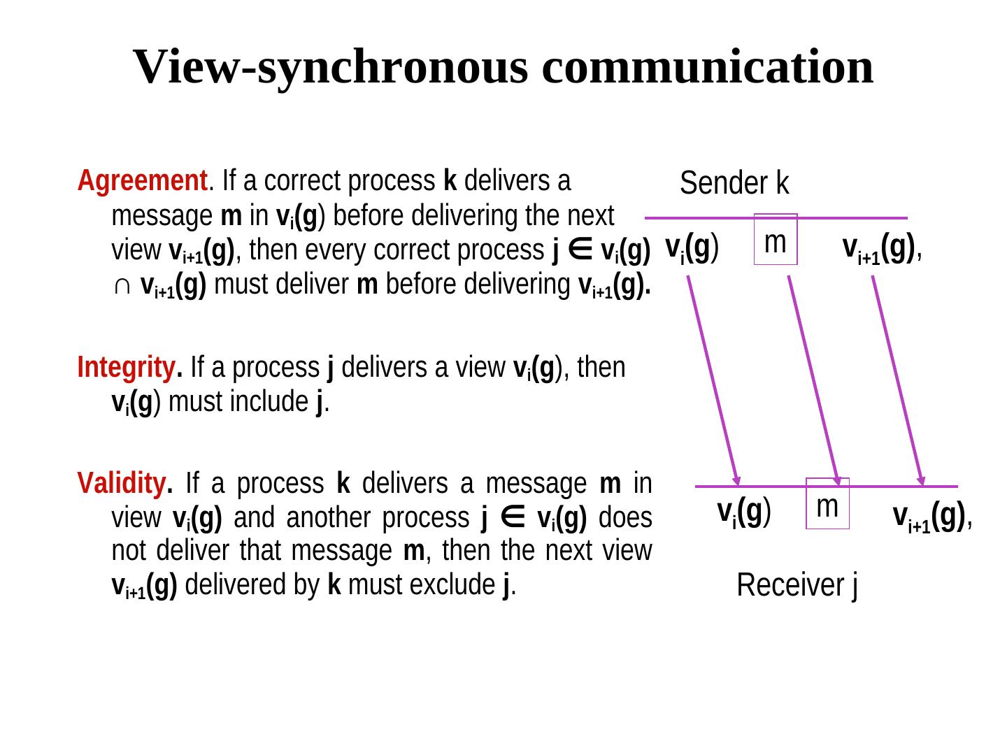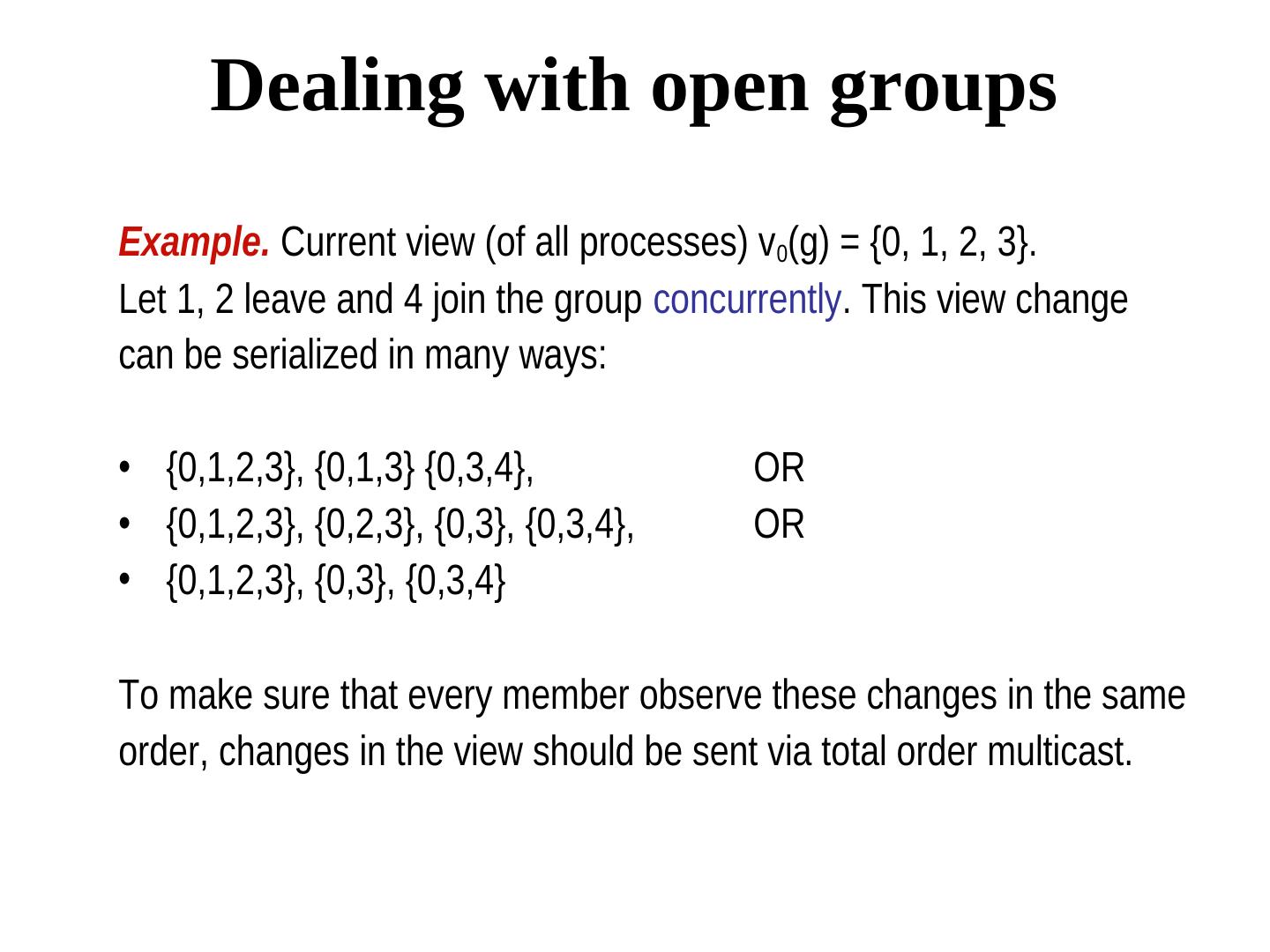27 . Dealing with open groups Example. Current view (of all processes) v0(g) = {0, 1, 2, 3}. Let 1, 2 leave and 4 join the group concurrently. This view change can be serialized in many ways: • {0,1,2,3}, {0,1,3} {0,3,4}, OR • {0,1,2,3}, {0,2,3}, {0,3}, {0,3,4}, OR • {0,1,2,3}, {0,3}, {0,3,4} To make sure that every member observe these changes in the same order, changes in the view should be sent via total order multicast.