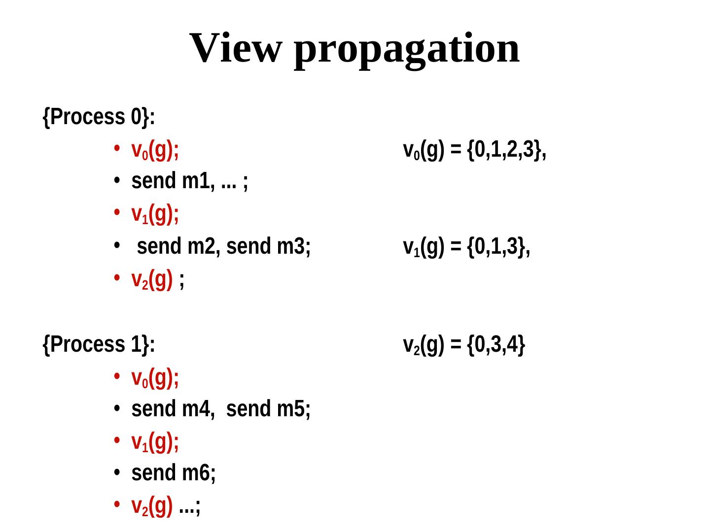 28 . View propagation {Process 0}: • v0(g); v0(g) = {0,1,2,3}, • send m1, ... ; • v1(g); • send m2, send m3; v1(g) = {0,1,3}, • v2(g) ; {Process 1}: v2(g) = {0,3,4} • v0(g); • send m4, send m5; • v1(g); • send m6; • v2(g) ...;