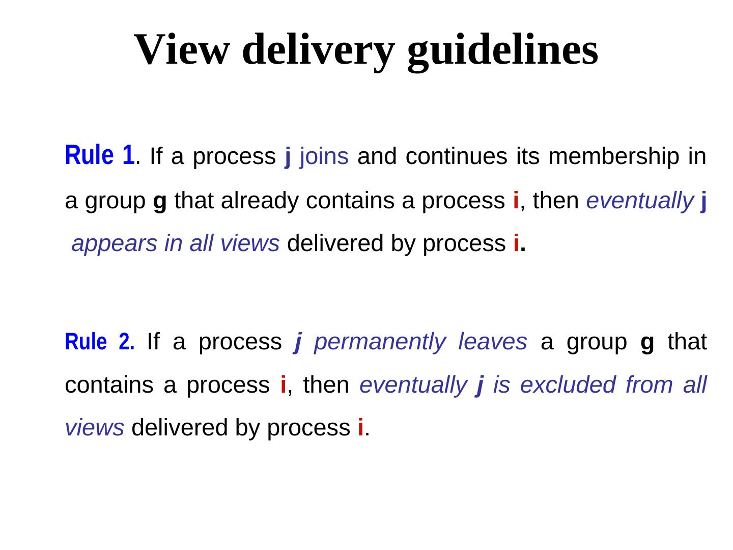 29 . View delivery guidelines Rule 1. If a process j joins and continues its membership in a group g that already contains a process i, then eventually j appears in all views delivered by process i. Rule 2. If a process j permanently leaves a group g that contains a process i, then eventually j is excluded from all views delivered by process i.