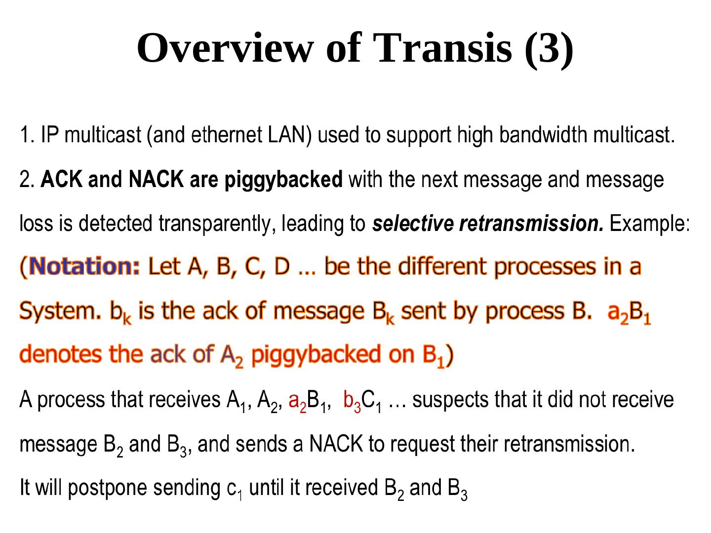 22 . Scalable Reliable Multicast If omission failures are rare, then then instead of using ACK, receivers will only report the non-receipt of messages using NACK. If several members of a group fail to receive a message, then each such member waits for a random period of time before sending its NACK. This helps to suppress redundant NACKs. Sender multicasts the missing copy only once. Use of cached copies in the network and selective point-to-point retransmission further reduces the traffic.