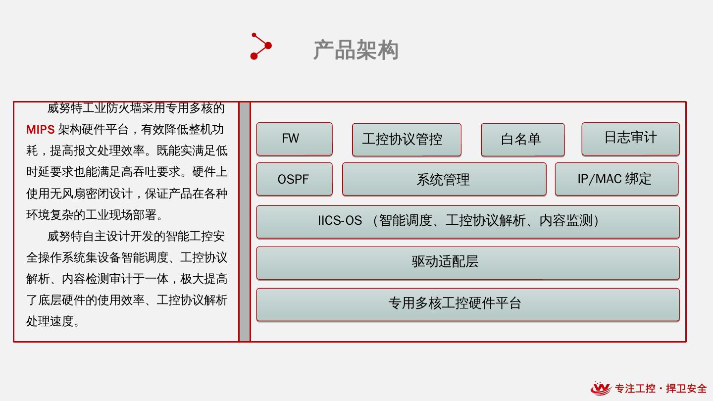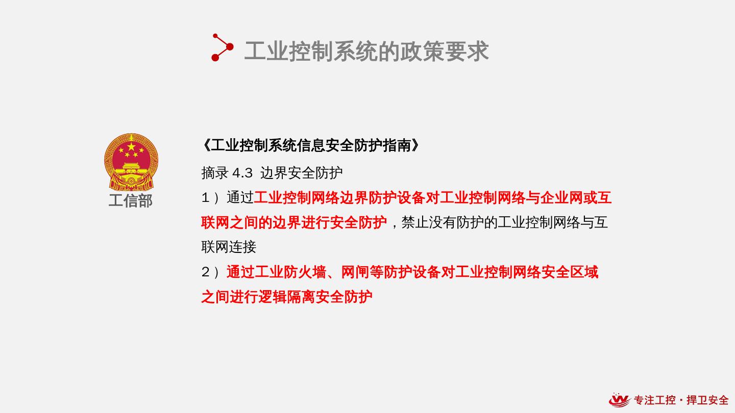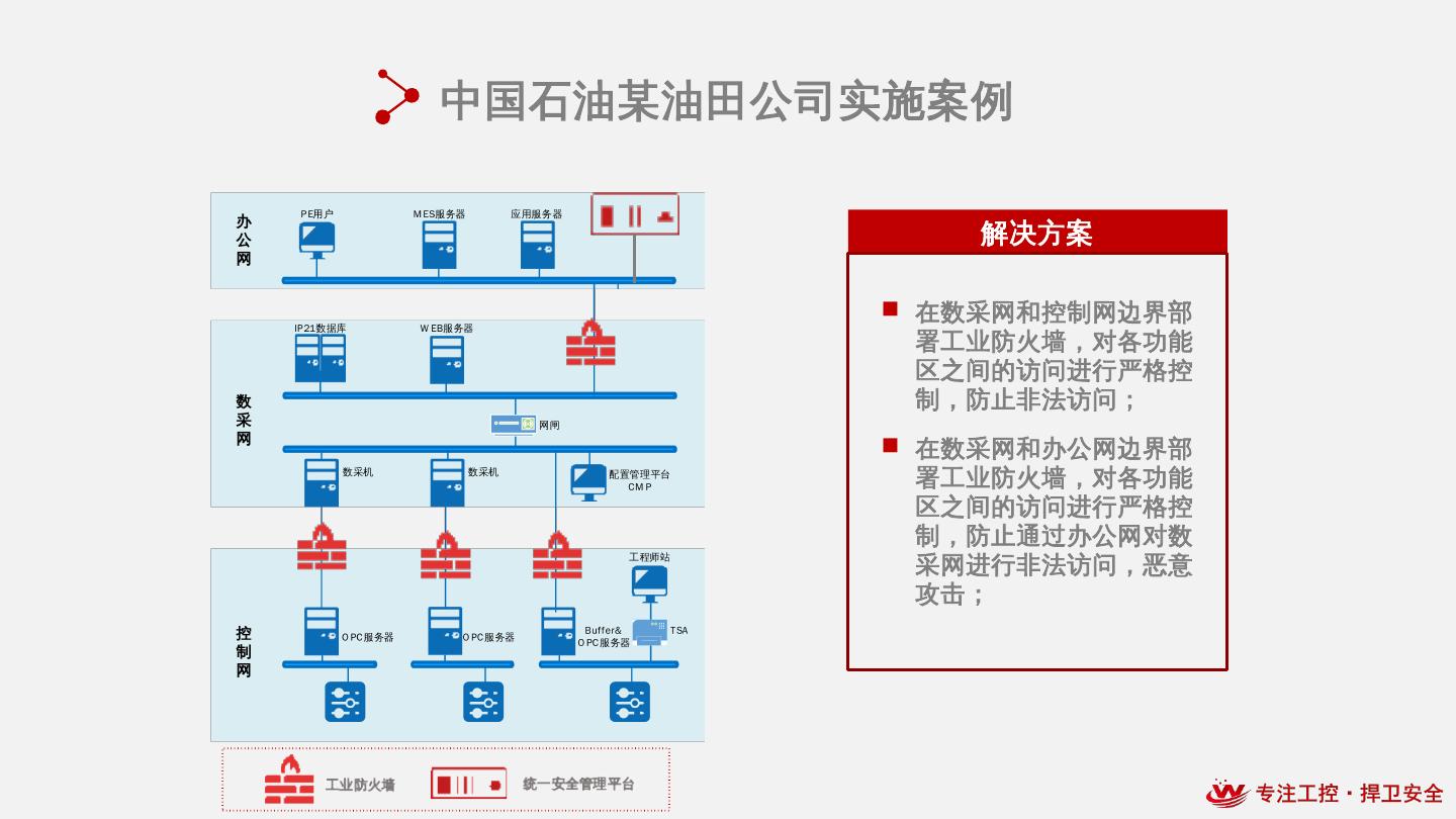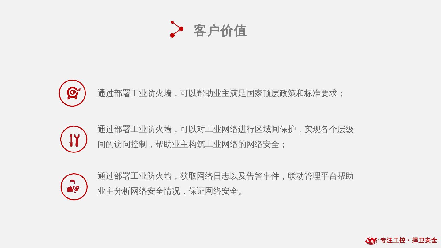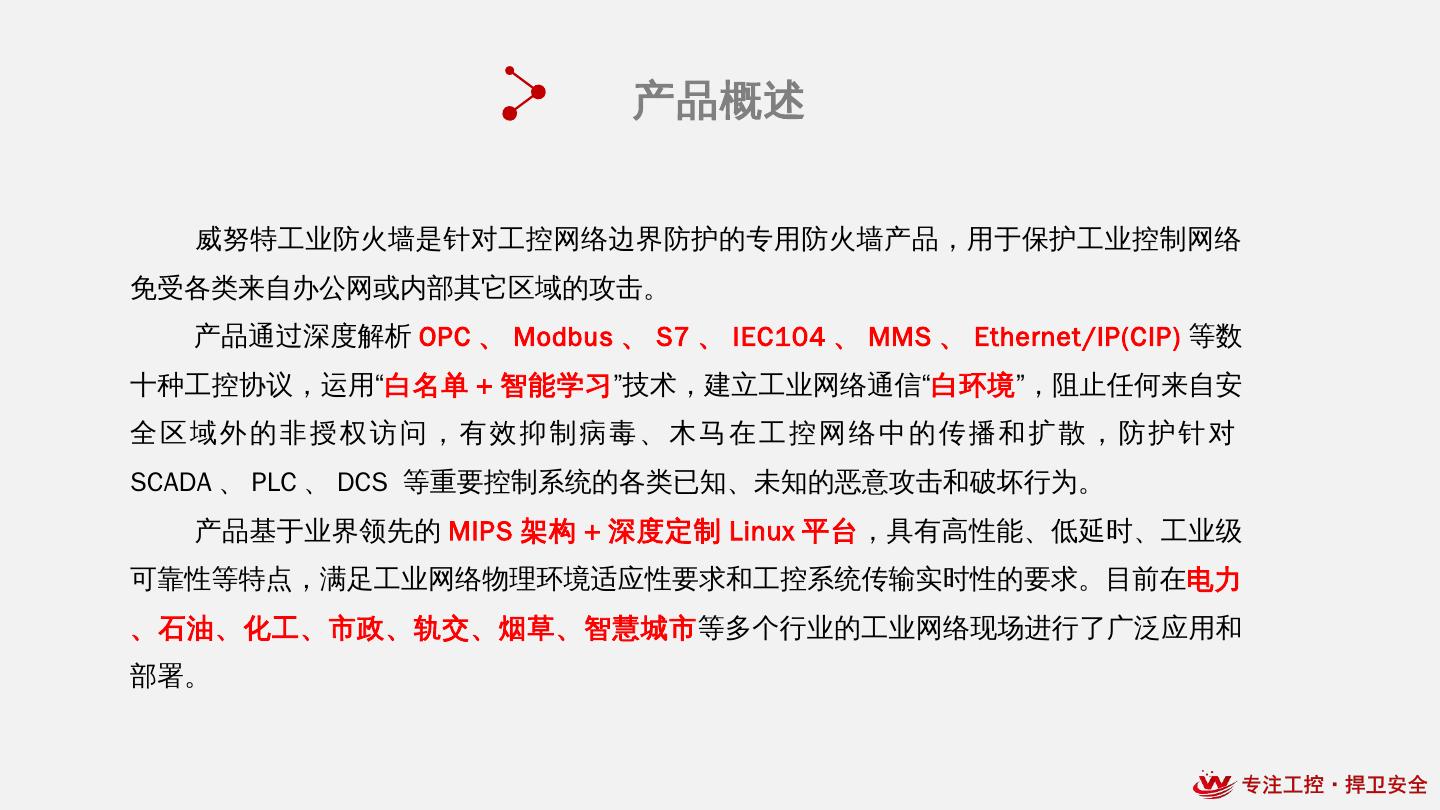 2)通过工业防火墙、网闸等防护设备对工业控制网络安全区域之间进行逻辑隔离安全 ... 威努特工业防火墙利用工业协议深度包解析技术,实现强大的工业协议白名单 ...