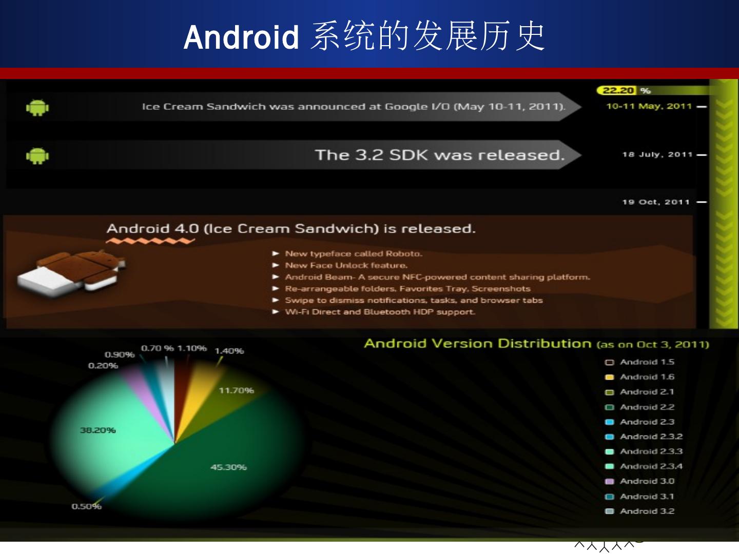 4 . Android 系统的发展历史 Android 早期由 “ Android 之父 ”之称的安迪 · 鲁宾创 办, Google 于2005年并购了成立不到 2 年的高科技 企业 Android ,展开了短信、手机检索、定位等业务, 基于 Linux 的通用平台进入了开发。 Google公司在2007年11月 5日正式公布这个操作系 统, 2008 年, Patrick Brady 于 Google I/O演讲 “ Anat omy & Physiology of an Android” ,并提出的 Androi d HAL 架构图。 HAL以 *.so 档的形式存在,可以把 An droid framework 与 Linux kernel 隔开。 2010 年 2 月 3 日, Linux 内核开发者 Greg Kroah-Hart man 将 Android 的驱动程序从 Linux 内核 “状态树 ” ( “ staging tree” )上除去,从此, Android 与 Linux 核心开发分道扬镳。 [