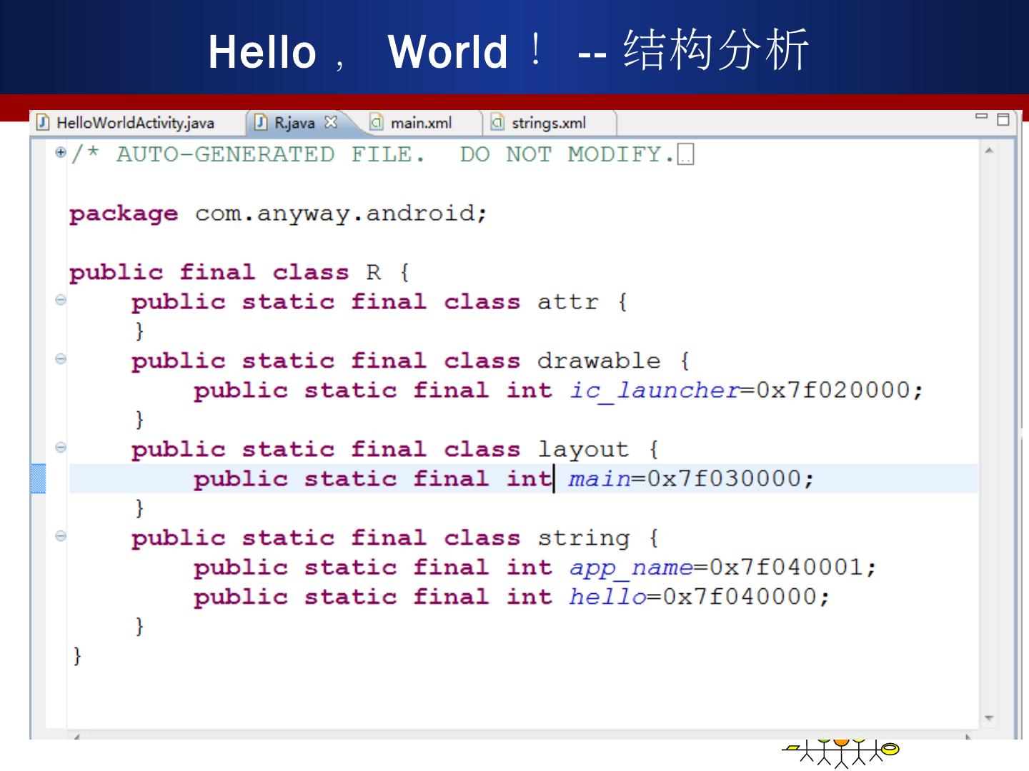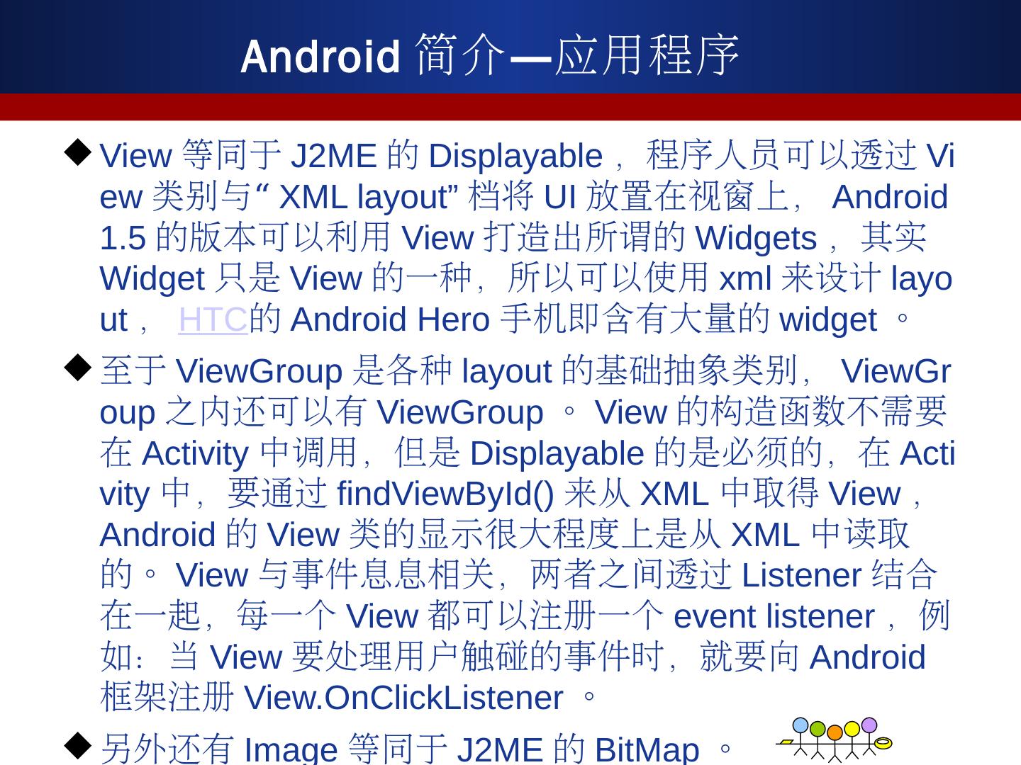 13 . Android 简介 —应用程序 View 等同于 J2ME 的 Displayable ,程序人员可以透过 Vi ew 类别与“ XML layout” 档将 UI 放置在视窗上, Android 1.5 的版本可以利用 View 打造出所谓的 Widgets ,其实 Widget 只是 View 的一种,所以可以使用 xml 来设计 layo ut , HTC的 Android Hero 手机即含有大量的 widget 。 至于 ViewGroup 是各种 layout 的基础抽象类别, ViewGr oup 之内还可以有 ViewGroup 。 View 的构造函数不需要 在 Activity 中调用,但是 Displayable 的是必须的,在 Acti vity 中,要通过 findViewById() 来从 XML 中取得 View , Android 的 View 类的显示很大程度上是从 XML 中读取 的。 View 与事件息息相关,两者之间透过 Listener 结合 在一起,每一个 View 都可以注册一个 event listener ,例 如:当 View 要处理用户触碰的事件时,就要向 Android 框架注册 View.OnClickListener 。 另外还有 Image 等同于 J2ME 的 BitMap 。