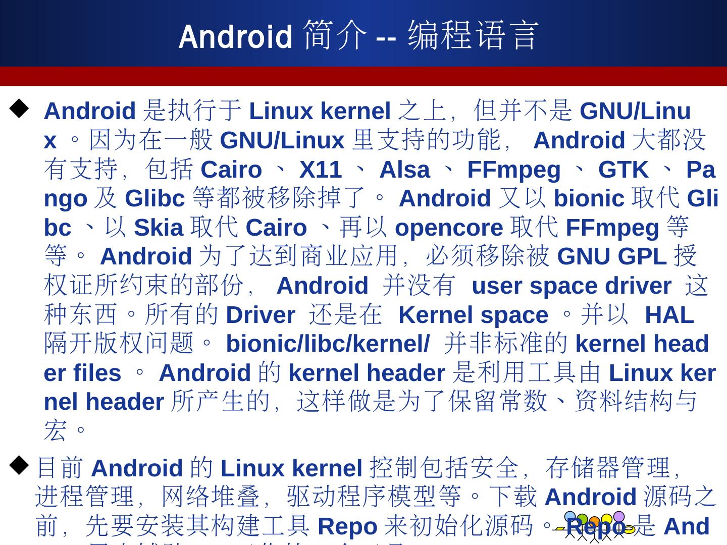 16 . Android 简介 -- 编程语言 Android 是执行于 Linux kernel 之上,但并不是 GNU/Linu x 。因为在一般 GNU/Linux 里支持的功能, Android 大都没 有支持,包括 Cairo 、 X11 、 Alsa 、 FFmpeg 、 GTK 、 Pa ngo 及 Glibc 等都被移除掉了。 Android 又以 bionic 取代 Gli bc 、以 Skia 取代 Cairo 、再以 opencore 取代 FFmpeg 等 等。 Android 为了达到商业应用,必须移除被 GNU GPL 授 权证所约束的部份, Android 并没有 user space driver 这 种东西。所有的 Driver 还是在 Kernel space 。并以 HAL 隔开版权问题。 bionic/libc/kernel/ 并非标准的 kernel head er files 。 Android 的 kernel header 是利用工具由 Linux ker nel header 所产生的,这样做是为了保留常数、资料结构与 宏。 目前 Android 的 Linux kernel 控制包括安全,存储器管理, 进程管理,网络堆叠,驱动程序模型等。下载 Android 源码之 前,先要安装其构建工具 Repo 来初始化源码。 Repo 是 And