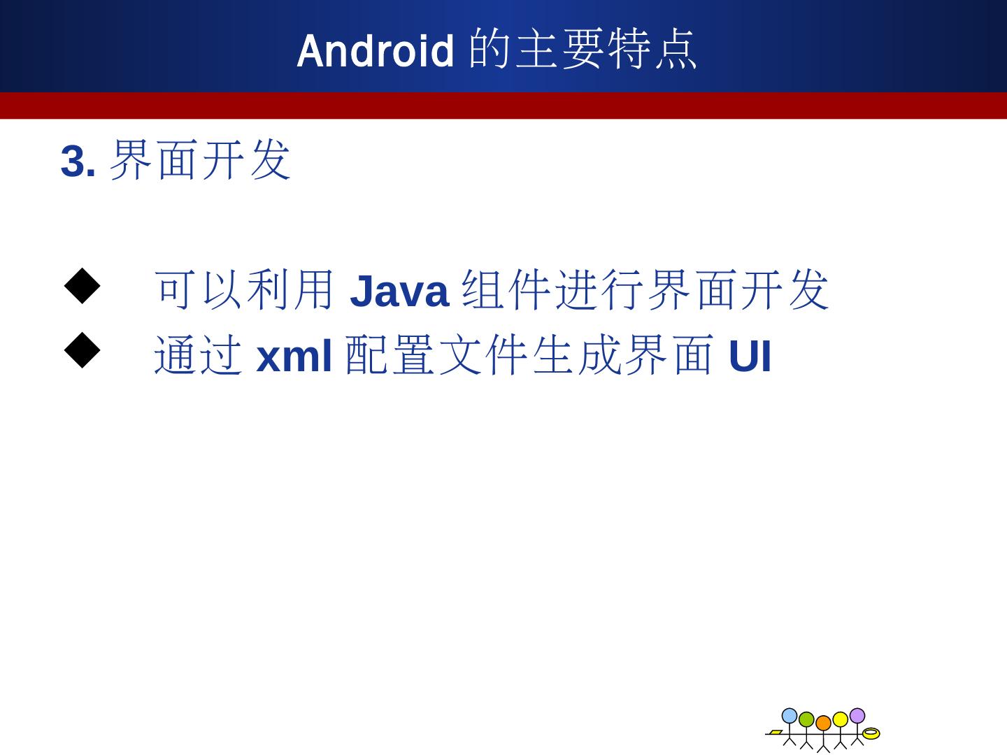 20 . Android 的主要特点 3. 界面开发 可以利用 Java 组件进行界面开发 通过 xml 配置文件生成界面 UI