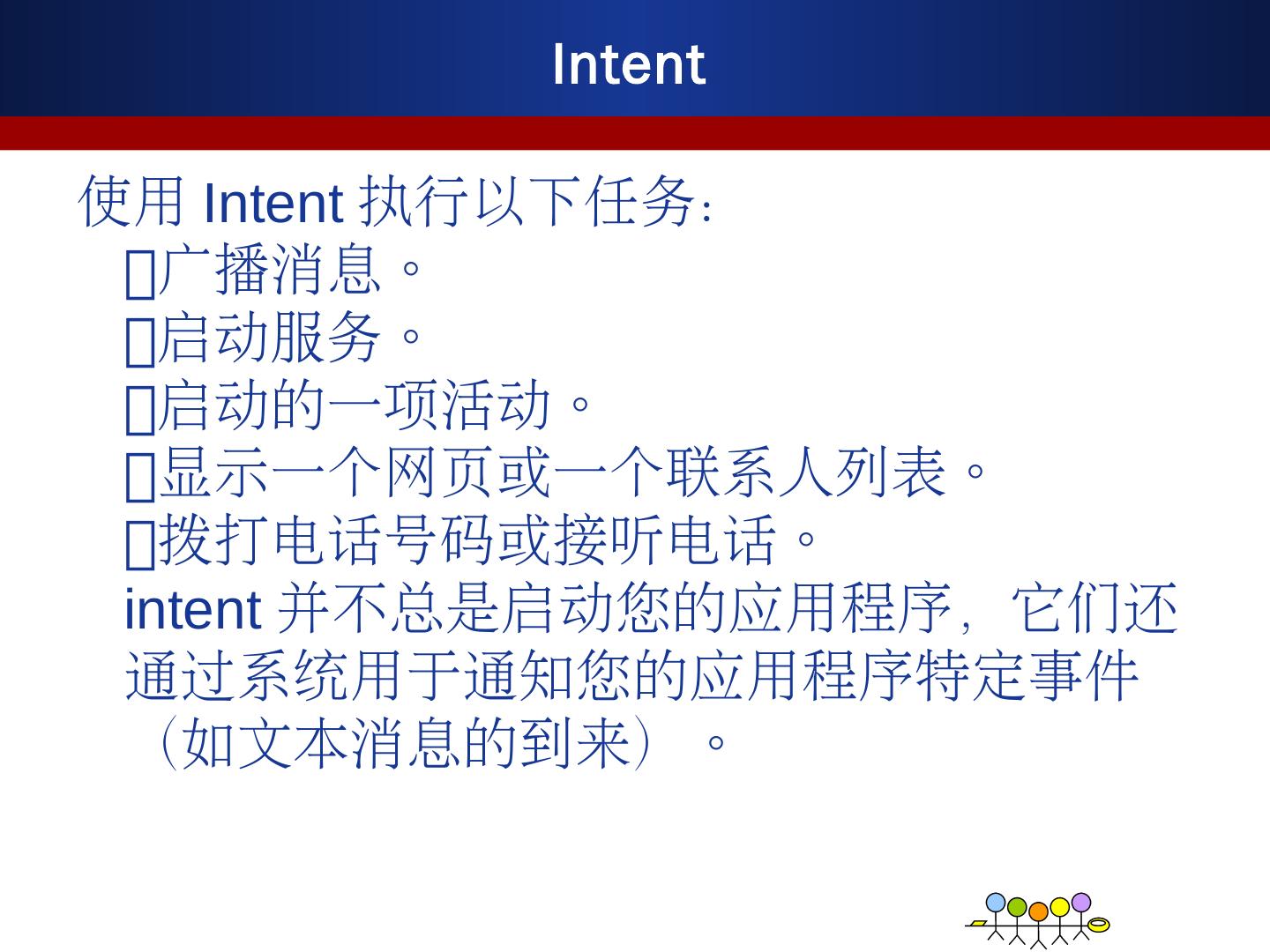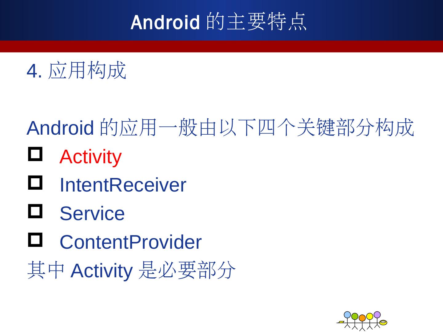 21 . Android 的主要特点 4. 应用构成 Android 的应用一般由以下四个关键部分构成 Activity IntentReceiver Service ContentProvider 其中 Activity 是必要部分