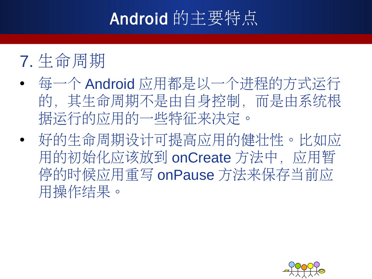 24 . Android 的主要特点 7. 生命周期 • 每一个 Android 应用都是以一个进程的方式运行 的,其生命周期不是由自身控制,而是由系统根 据运行的应用的一些特征来决定。 • 好的生命周期设计可提高应用的健壮性。比如应 用的初始化应该放到 onCreate 方法中,应用暂 停的时候应用重写 onPause 方法来保存当前应 用操作结果。