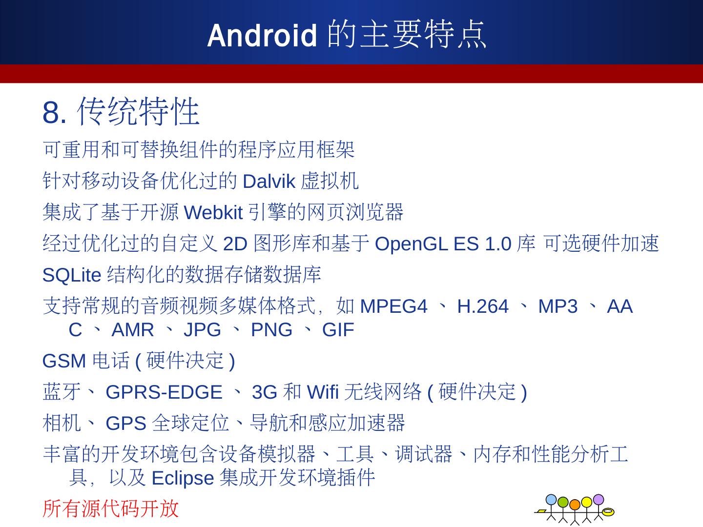 25 . Android 的主要特点 8. 传统特性 可重用和可替换组件的程序应用框架 针对移动设备优化过的 Dalvik 虚拟机 集成了基于开源 Webkit 引擎的网页浏览器 经过优化过的自定义 2D 图形库和基于 OpenGL ES 1.0 库 可选硬件加速 SQLite 结构化的数据存储数据库 支持常规的音频视频多媒体格式,如 MPEG4 、 H.264 、 MP3 、 AA C 、 AMR 、 JPG 、 PNG 、 GIF GSM 电话 ( 硬件决定 ) 蓝牙、 GPRS-EDGE 、 3G 和 Wifi 无线网络 ( 硬件决定 ) 相机、 GPS 全球定位、导航和感应加速器 丰富的开发环境包含设备模拟器、工具、调试器、内存和性能分析工 具,以及 Eclipse 集成开发环境插件 所有源代码开放