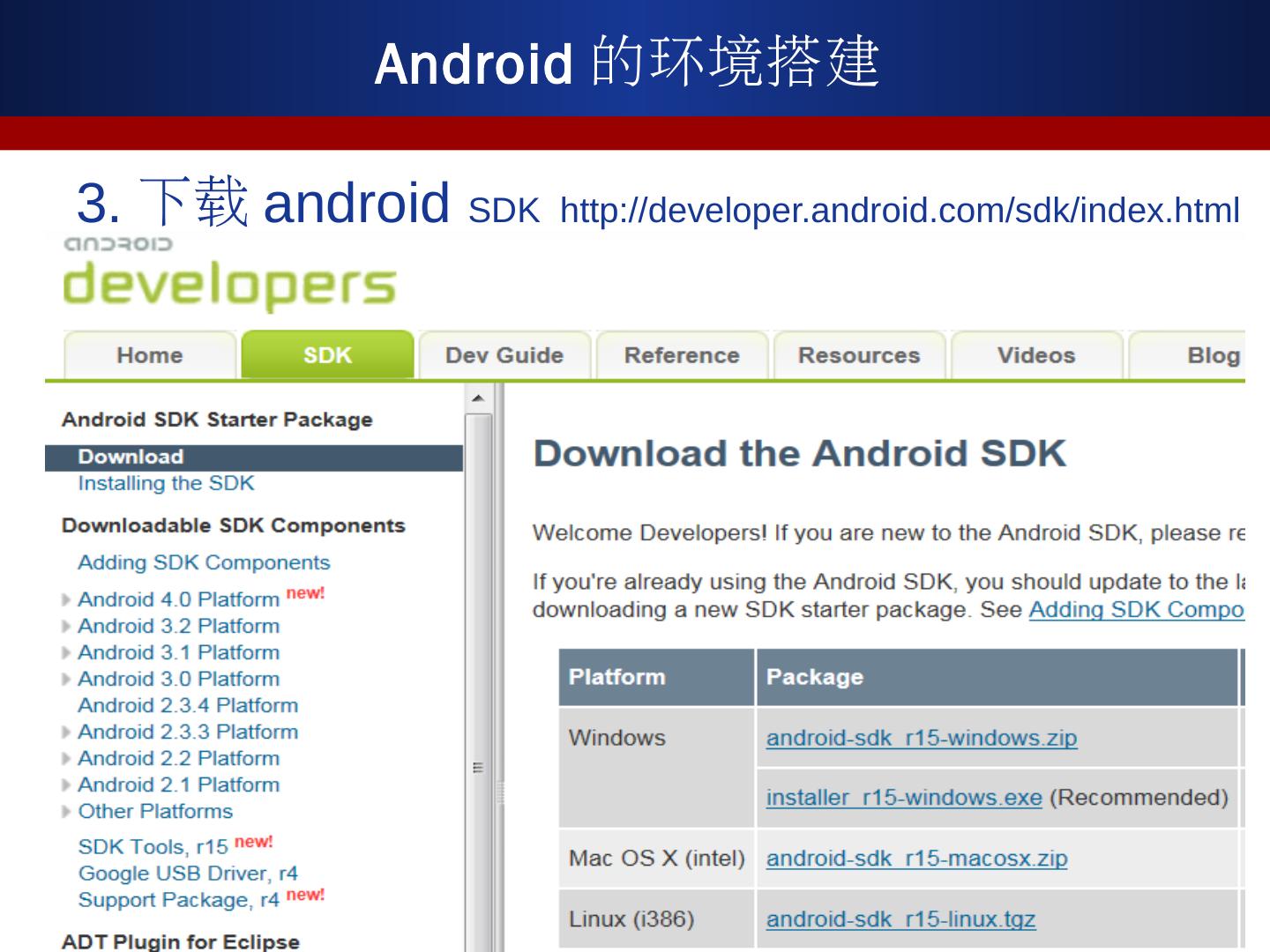 29 . Android 的环境搭建 3. 下载 android SDK http://developer.android.com/sdk/index.html