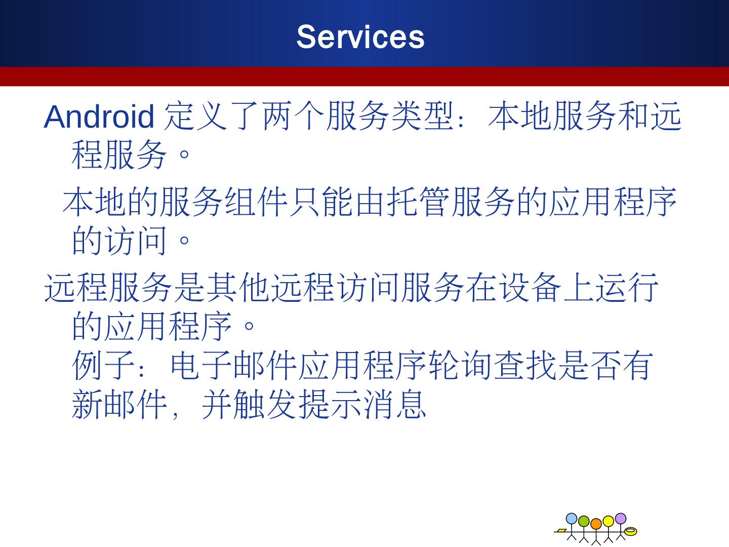 12 . Android 简介 —应用程序 Android 以 Linux 为核心的移动开发平台,使用 Java 作为编程语言,使接口到功能,都有层出 不穷的变化 其中 Activity 等同于 J2ME 的 MIDlet , Activity 类负责创建视窗,一个活动中的 Activity 就是在 fo 最前的窗体,背后执行的程序叫做 Service 。 两者之间透过由 ServiceConnection 和 AIDL 连 结,达到程序同时执行的效果。如果执行中的 Activity 全部画面被其他 Activity 取代时,该 Act ivity 便被停止,甚至被系统清除。