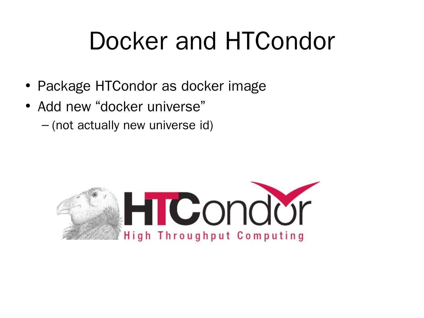 Docker and HTCondor. Greg Thain. HTCondor Week 2015. Start with the Basics … HTCondor is designed to: Allow a machine “owner” to loan it out.
