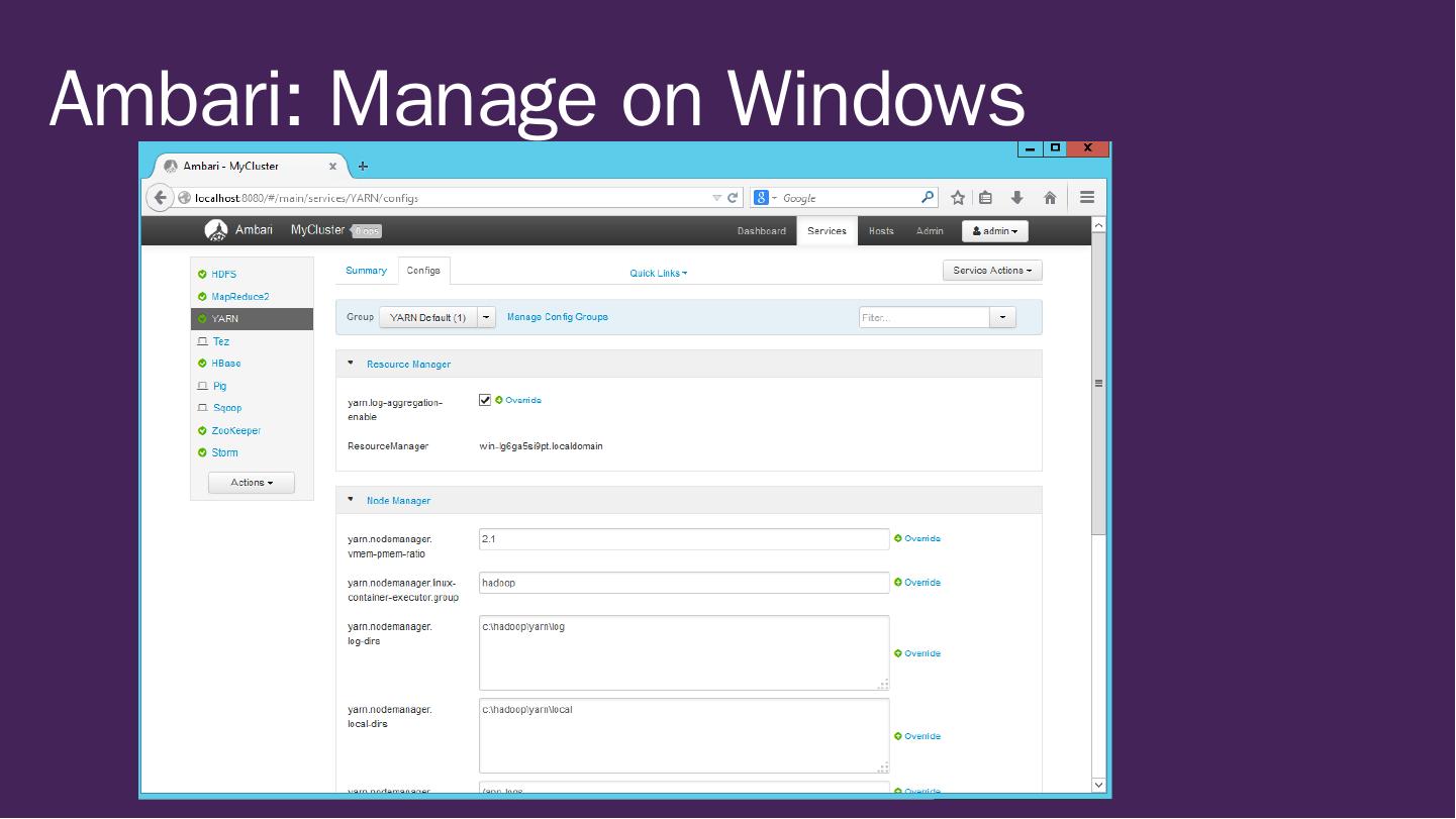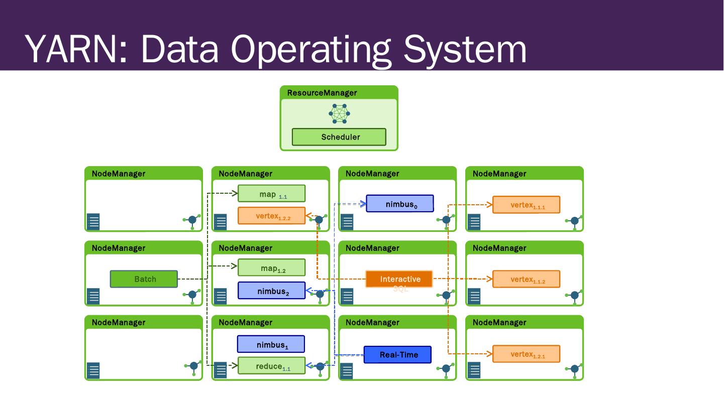 15 .YARN: Data Operating System NodeManager NodeManager NodeManager NodeManager map 1.1 vertex 1.2.2 NodeManager NodeManager NodeManager NodeManager NodeManager NodeManager NodeManager NodeManager map 1.2 reduce 1.1 Batch vertex 1.1.1 vertex 1.1.2 vertex 1.2.1 Interactive SQL ResourceManager Scheduler Real-Time nimbus 0 nimbus 1 nimbus 2