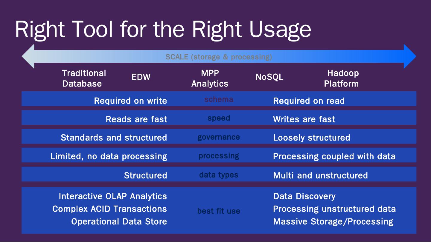 16 .Right Tool for the Right Usage Traditional Database SCALE (storage & processing) Hadoop Platform NoSQL MPP Analytics EDW s chema speed governance best fit use processing Required on write Required on read Reads are fast Writes are fast Standards and structured Loosely structured Limited, no data processing Processing coupled with data d ata types Structured Multi and unstructured Interactive OLAP Analytics Complex ACID Transactions Operational Data Store Data Discovery Processing unstructured data Massive Storage/Processing