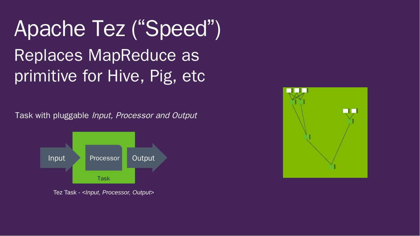 22 .Apache Tez (“Speed”) Replaces MapReduce as primitive for Hive, Pig, etc Task with pluggable Input, Processor and Output Tez Task - <Input, Processor, Output> Task Processor Input Output