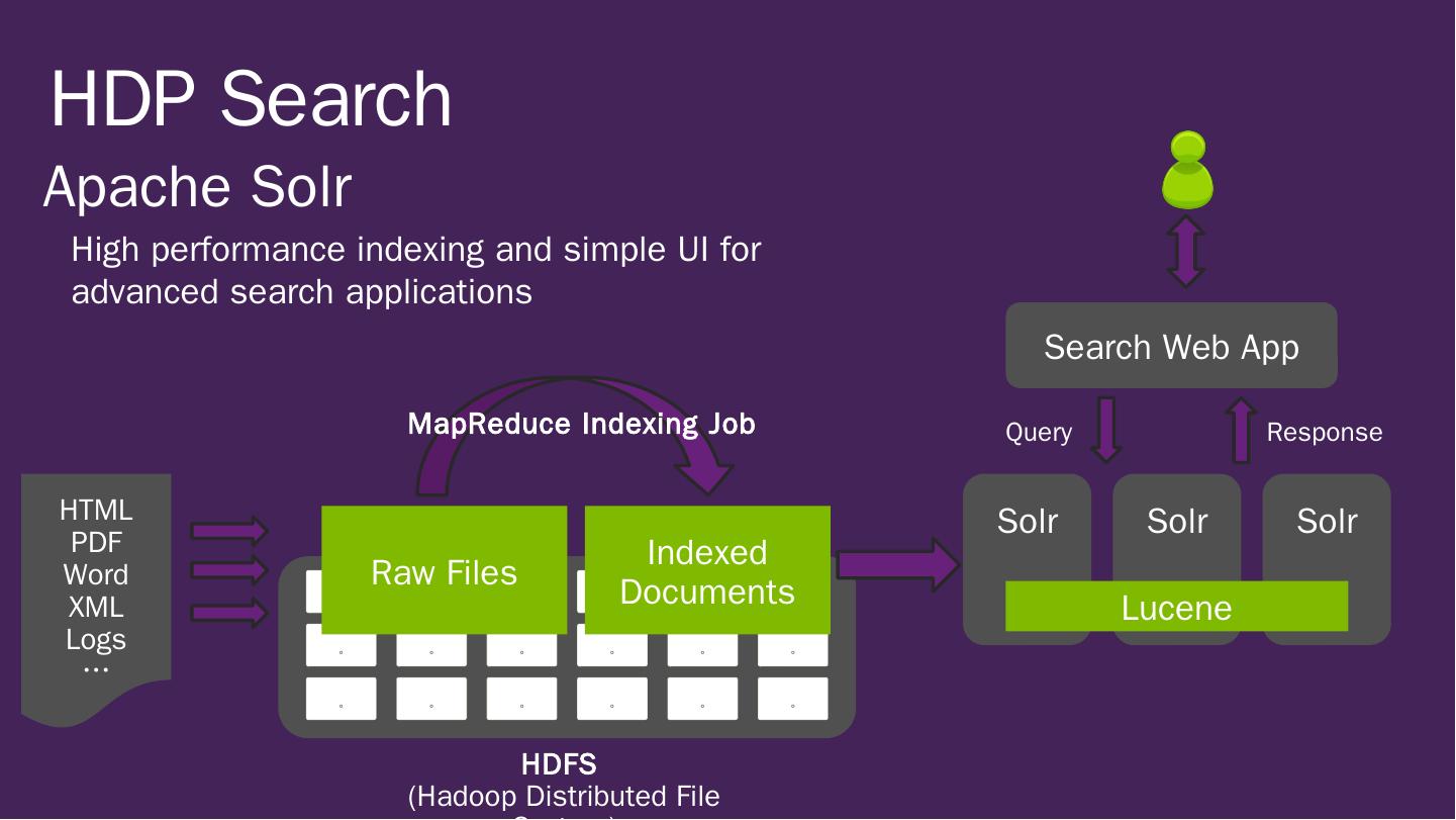 27 .HDP Search HDFS ( Hadoop Distributed File System ) ° ° ° ° ° ° ° ° ° ° ° ° ° ° ° ° ° ° Raw Files Indexed Documents MapReduce Indexing Job Solr Solr Solr Lucene HTML PDF Word XML Logs … Search Web App Query Response Apache Solr High performance indexing and simple UI for advanced search applications