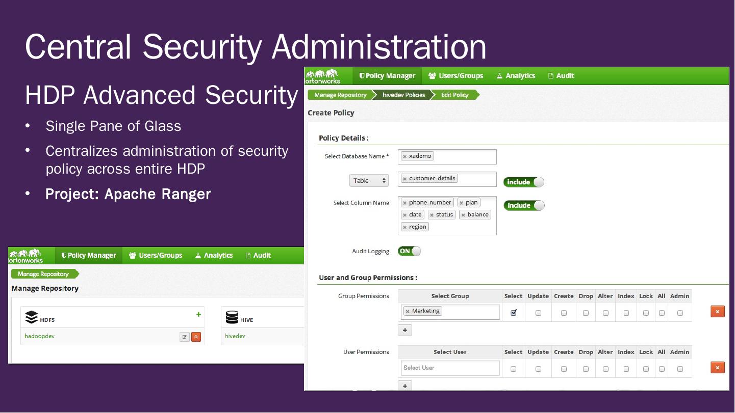 21 .SQL Access: Stinger Initiative Stinger Initiative Next generation SQL based interactive query in Hadoop Speed Interactive Hive Query response Scale queries that scale from TB to PB SQL broadest range of SQL semantics for analytic applications Business Analytics Custom Apps Apache YARN Apache MapReduce 1 ° ° ° ° ° ° ° ° ° ° ° ° ° N Apache Tez Apache Hive SQL ° ° ° ° ° ° HDFS (Hadoop Distributed File System) Apache Hive Contribution… an Open Community at its finest 1,672 Jira Tickets Closed 145 Developers 44 Companies ~390,000 Lines Of Code Added… (2x) 13 Months