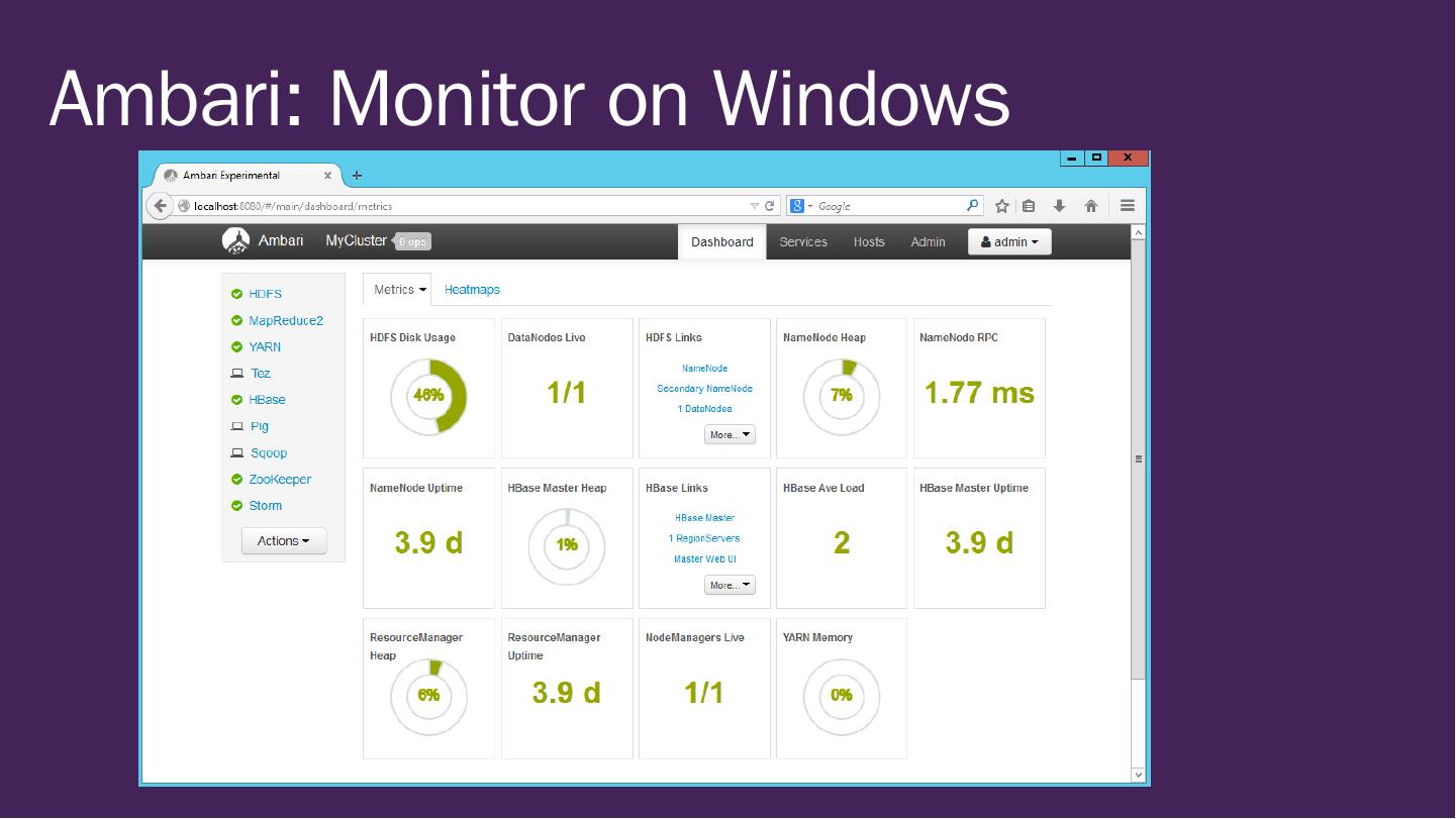10 .HDP for Windows Hortonworks Data Platform (HDP) The Only Completely Open Distribution for Apache Hadoop Fundamentally Versatile and Comprehensive enterprise capabilities Wholly Integrated for deep ecosystem interoperability Hortonworks Data Platform 2.2 YARN : Data Operating System (Cluster Resource Management) 1 ° ° ° ° ° ° ° ° ° ° ° ° ° ° ° Script Pig SQL Hive Tez Tez Java Scala Cascading Tez ° ° ° ° ° ° ° ° ° ° ° ° ° ° Others ISV Engines HDFS (Hadoop Distributed File System) Stream Storm Search Solr NoSQL HBase Slider Slider SECURITY GOVERNANCE OPERATIONS BATCH, INTERACTIVE & REAL-TIME DATA ACCESS In-Memory Spark Provision, Manage & Monitor Ambari Zookeeper Scheduling Oozie Data Workflow, Lifecycle & Governance Falcon Sqoop Flume WebHDFS Authentication Authorization Accounting Data Protection Storage: HDFS Resources: YARN Access: Hive, … Pipeline: Falcon Cluster: Knox Cluster: Ranger Deployment Choice Linux Windows On-Premises Cloud
