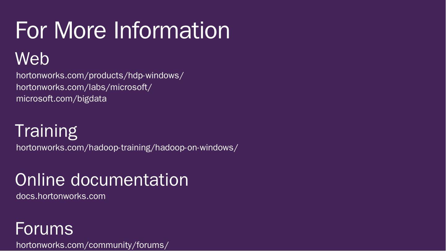 17 .Maximize Hadoop Deployment Choice Hortonworks Data Platform (HDP) for Windows 100% Apache open source Hadoop software for Windows Server Microsoft Azure HDInsight Hadoop -based managed service in the cloud via Microsoft Azure Microsoft Analytics Platform System (APS) Scale-out appliance with data warehousing and Hadoop in one box All offerings co-engineered by Hortonworks and Microsoft Enjoy seamless interoperability across on - premises and cloud
