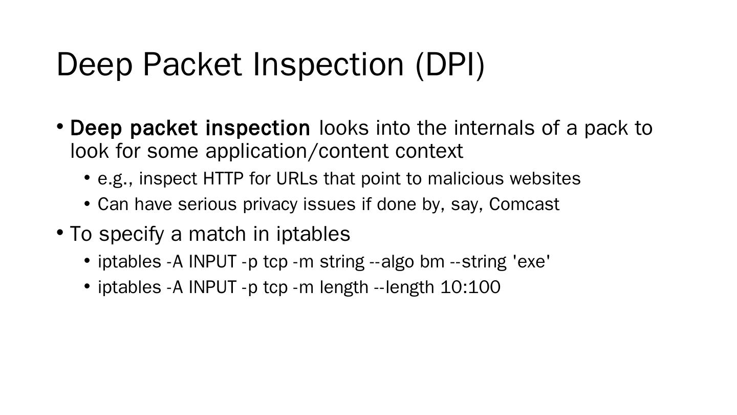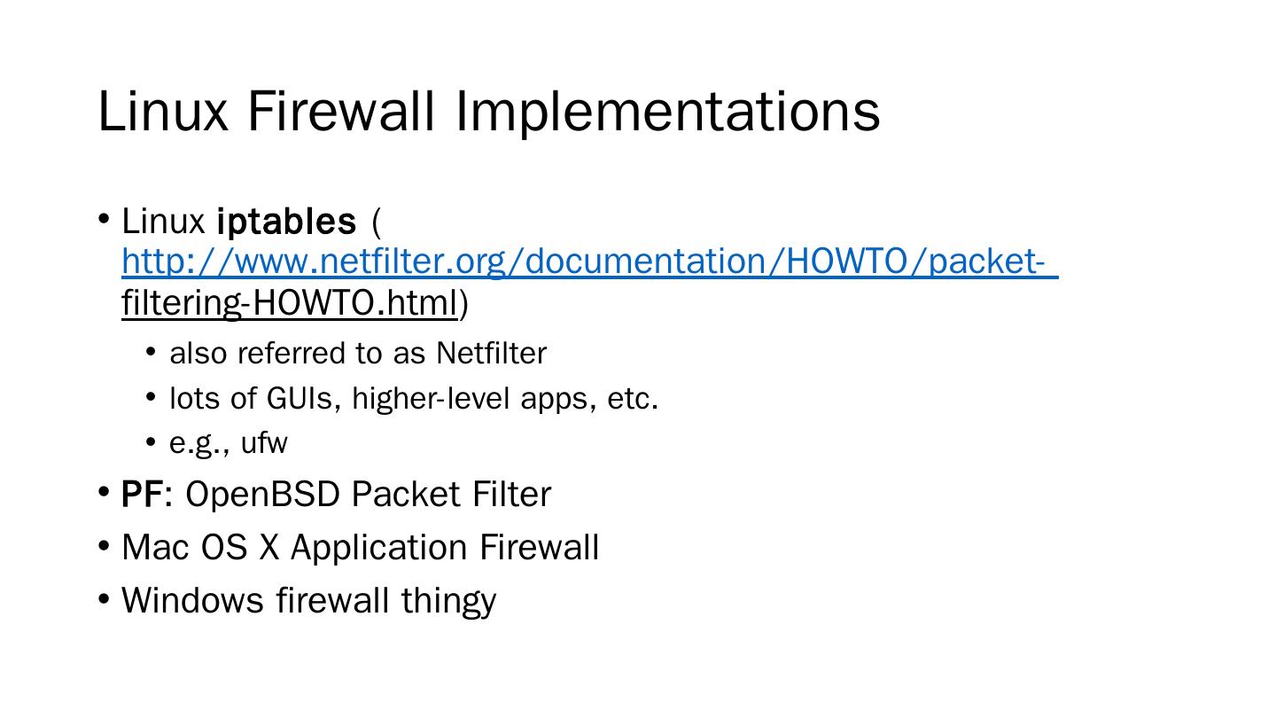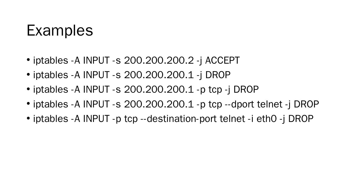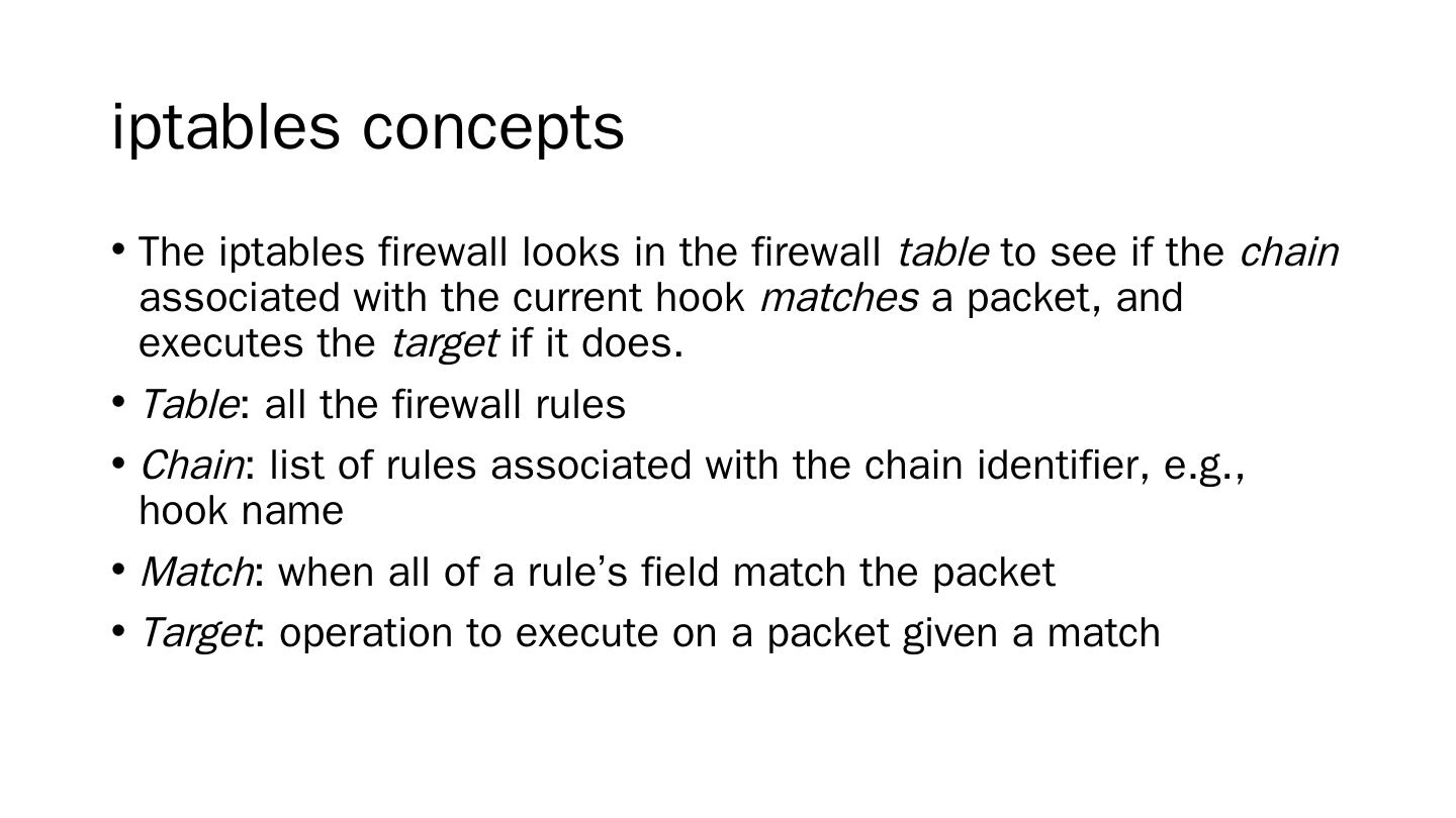 The iptables firewall looks in the firewall table to see if the chain associated with the current hook matches a packet, and executes the target if it does. Table: all ...