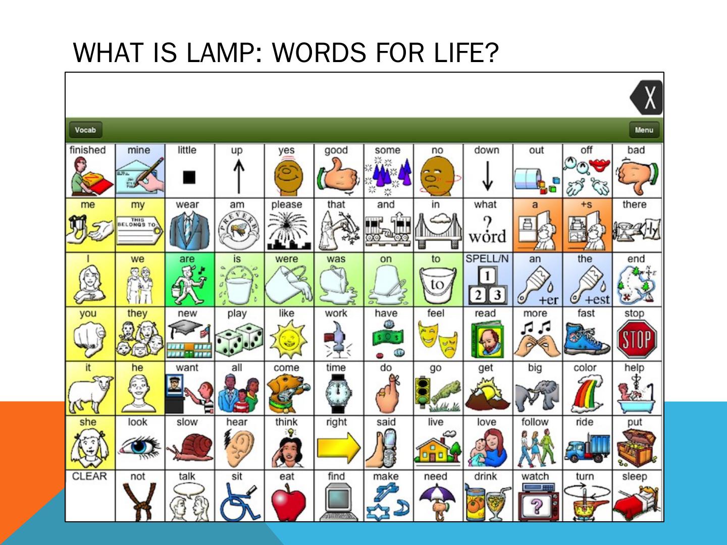 What is Lamp? The approach: Language Acquisition through Motor Planning. The device: iPad. The app: LAMP Words for Life. Accessing each word on the ...