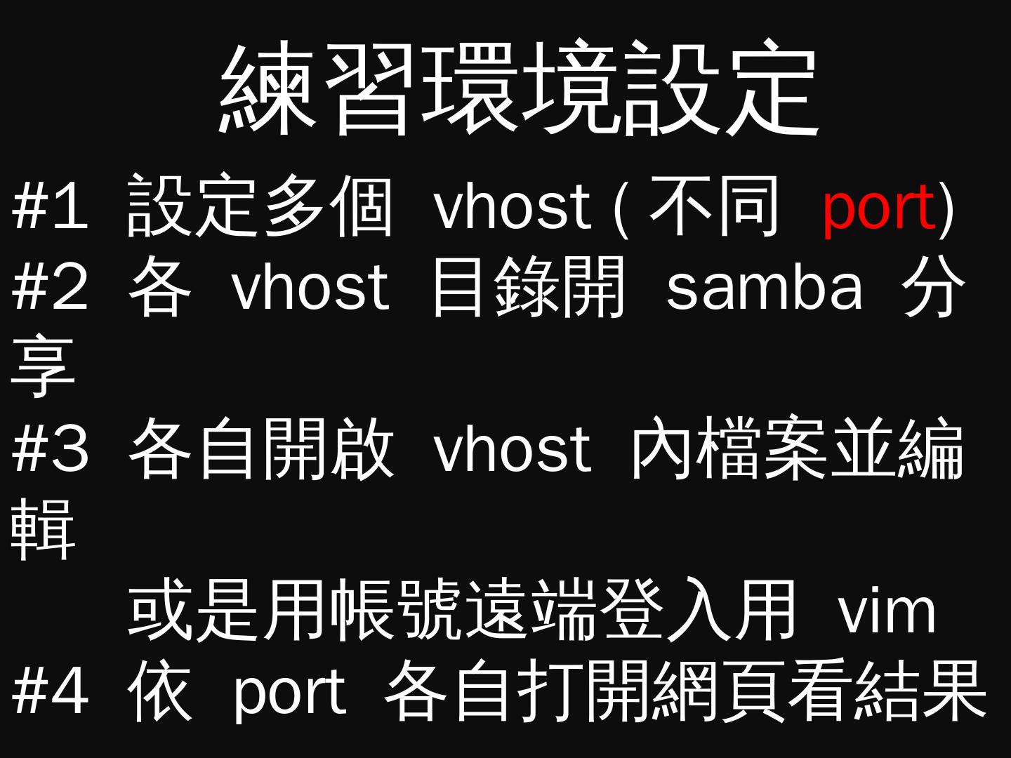 #4 Regex 正則表達式. 所需程式技術. #1 設定多個vhost (不同port). #2 各vhost 目錄開samba 分享. #3 各自開啟vhost 內檔案並編輯. 或是用帳號遠端登入用vim.